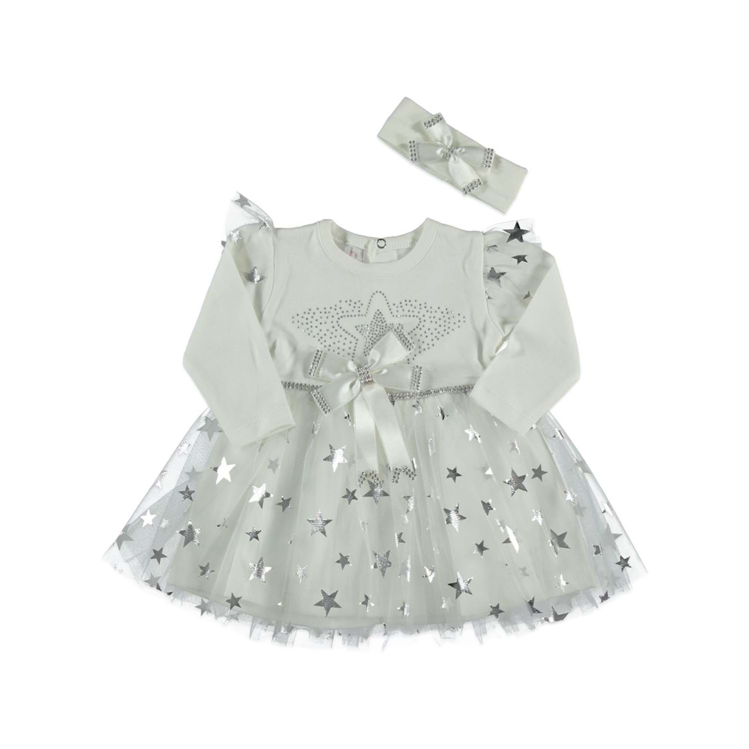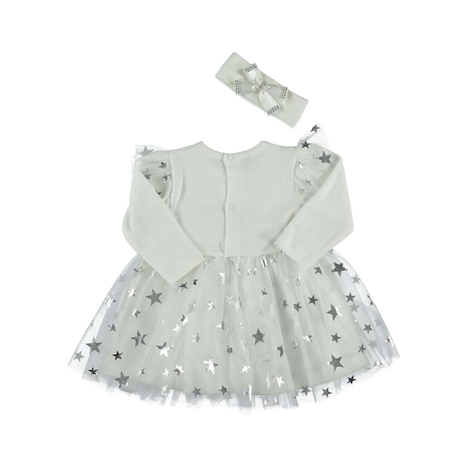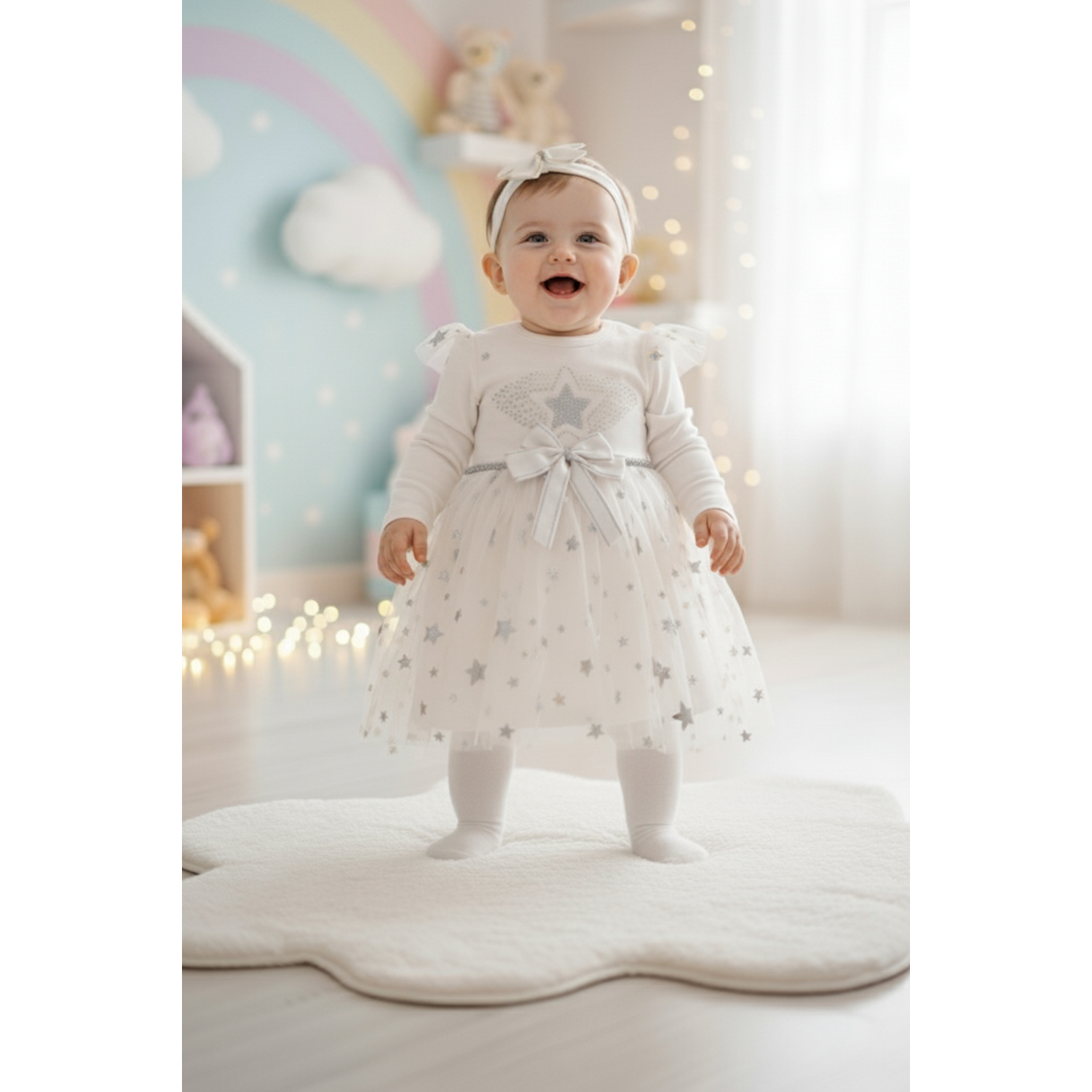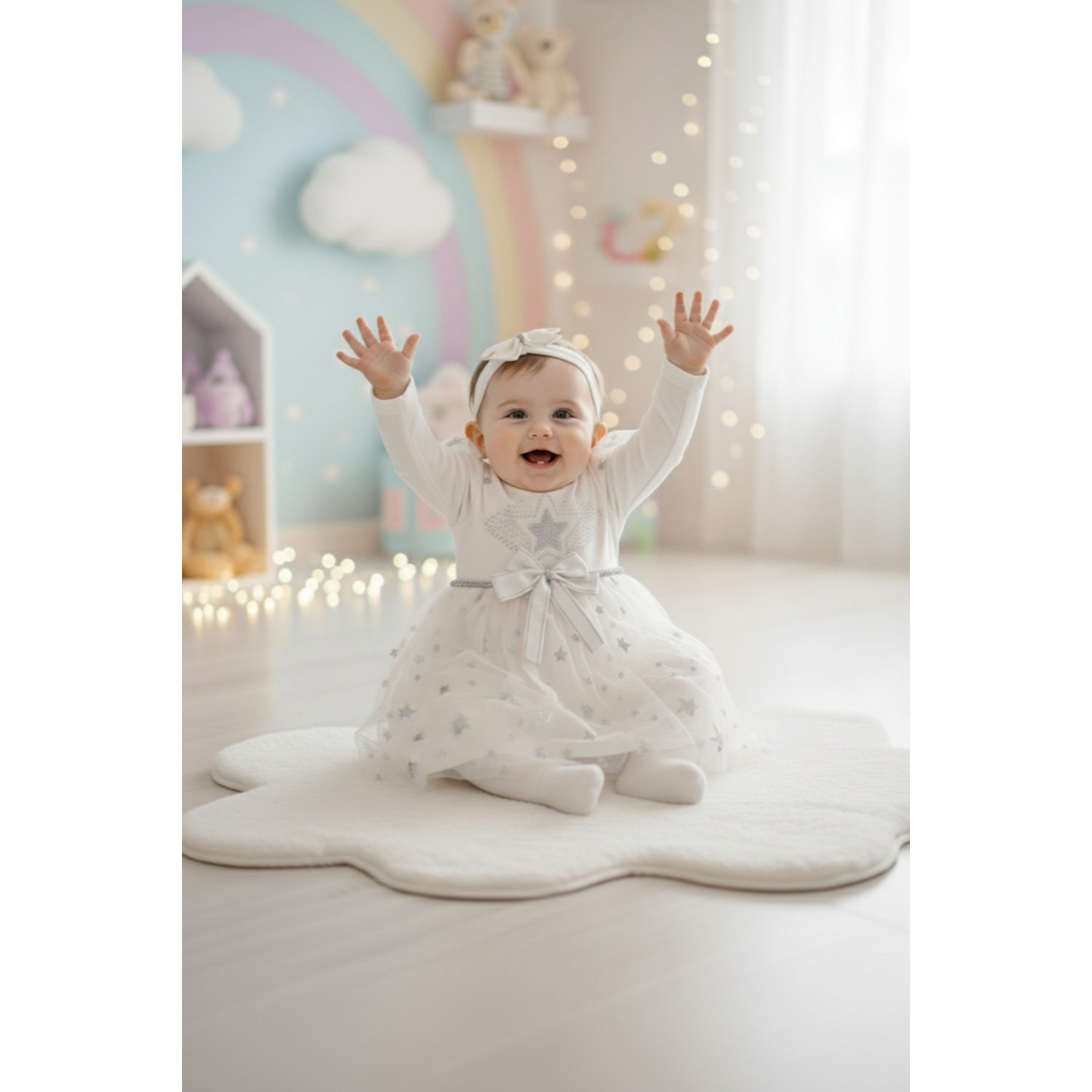 Küçük prenseslerin özel anlarına yakışacak şekilde tasarlanmış bir elbisedir. Üst kısmında kullanılan %100 pamuk penye, bebeğinizin hassas cildine dost bir dokunuş sunar; gün boyu rahat hareket edip terlemeyi minimuma indirir. Göğüs bölümündeki taşlı yıldız deseni, elbiseye nazik bir parlaklık katar ve tül etekteki altın & siyah varaklı yıldız detaylarıyla uyumlu bir bütün oluşturur.