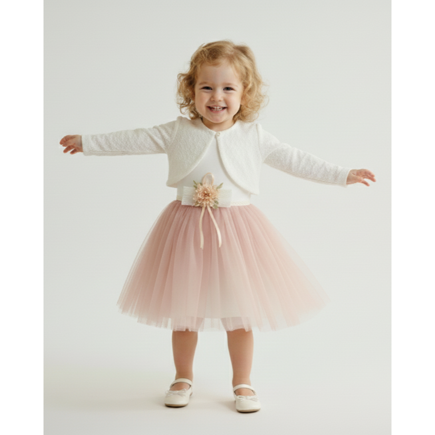 Şıklığı ve zarafeti bir arada sunan triko bolerolu kız bebek elbise modeli, minik prenseslerin özel günlerde parlaması için tasarlandı. Ekru renk elbisesi ve pudra tonlarında triko bolerosu ile zarif bir bütünlük oluşturan bu model, hem klasik hem modern bir görünüm sunar.