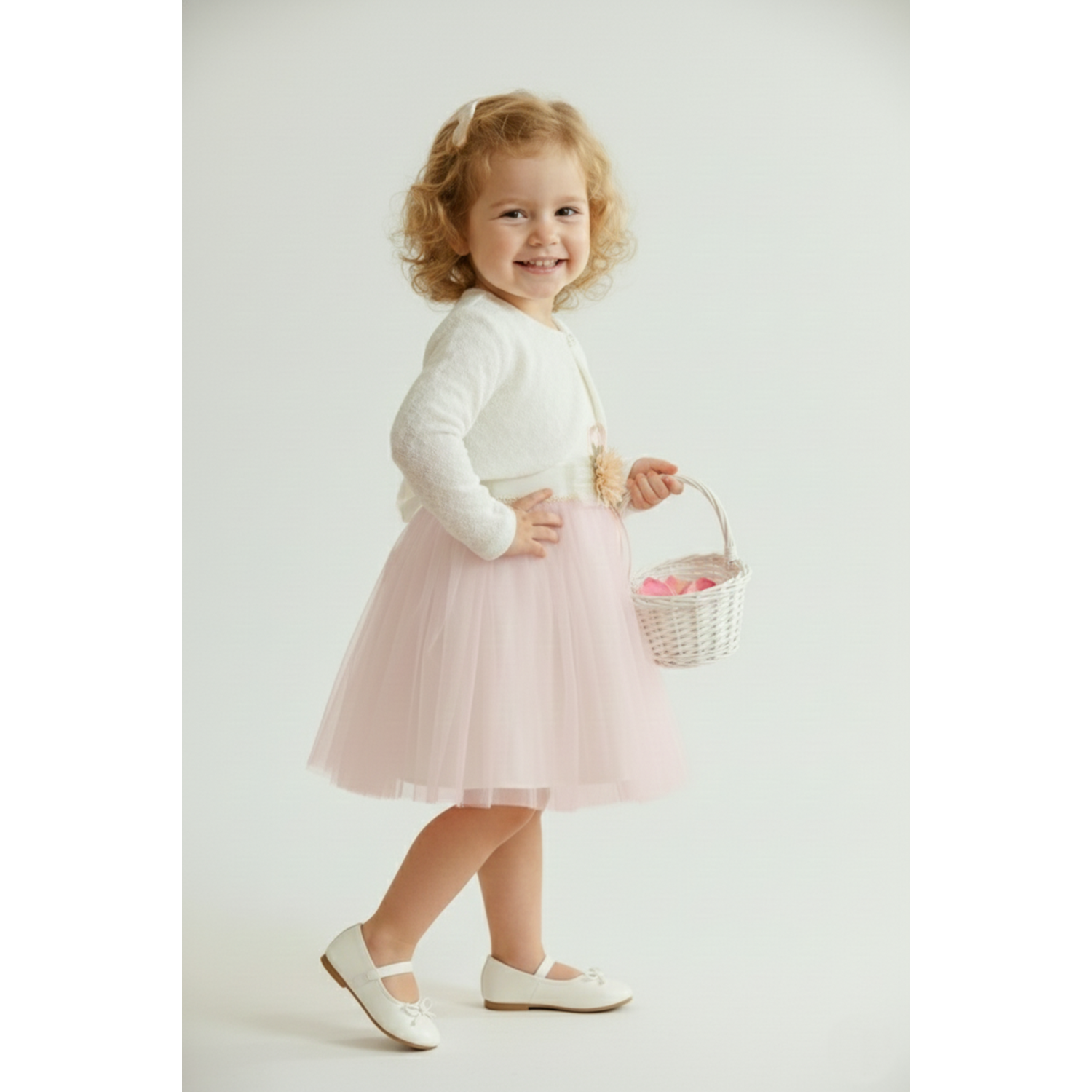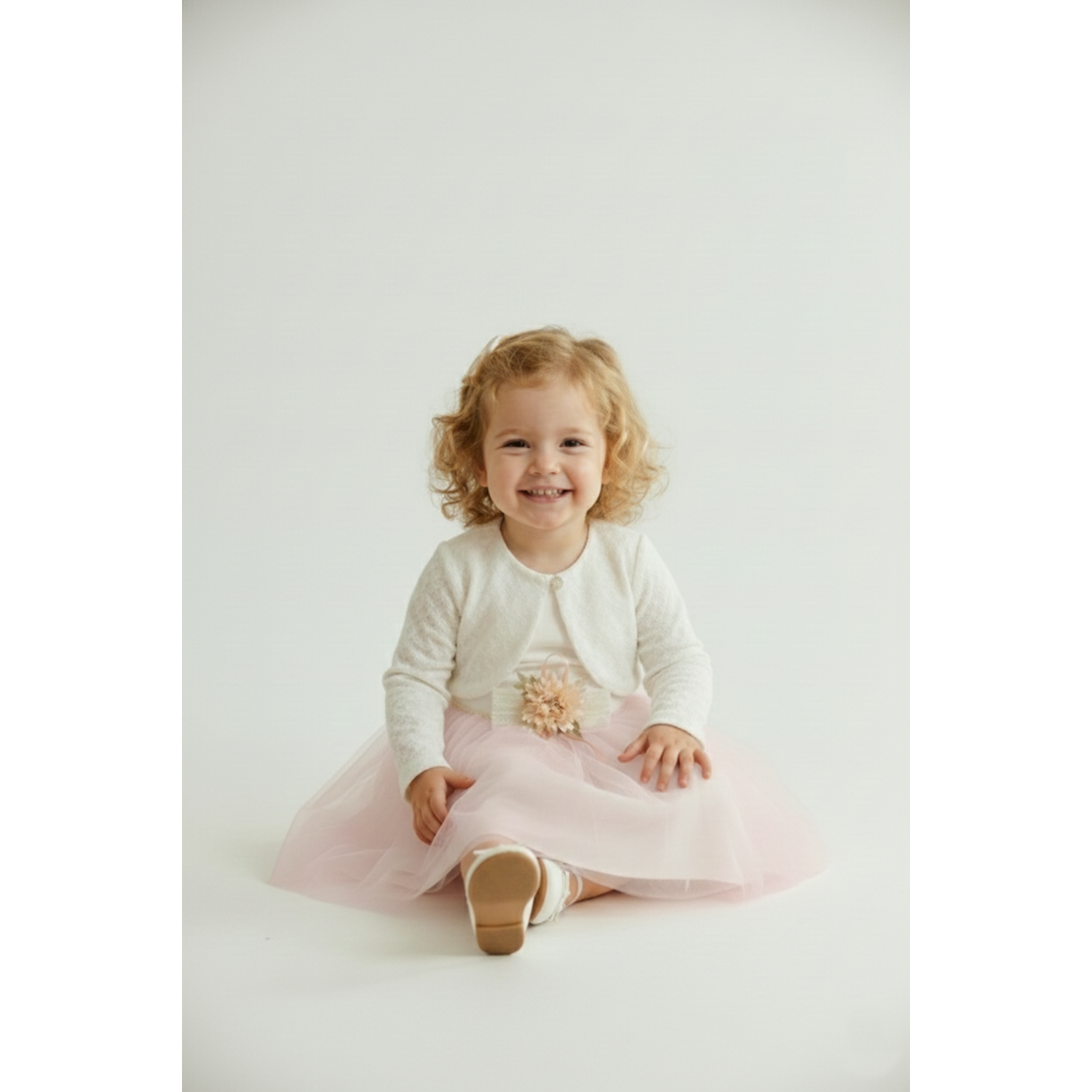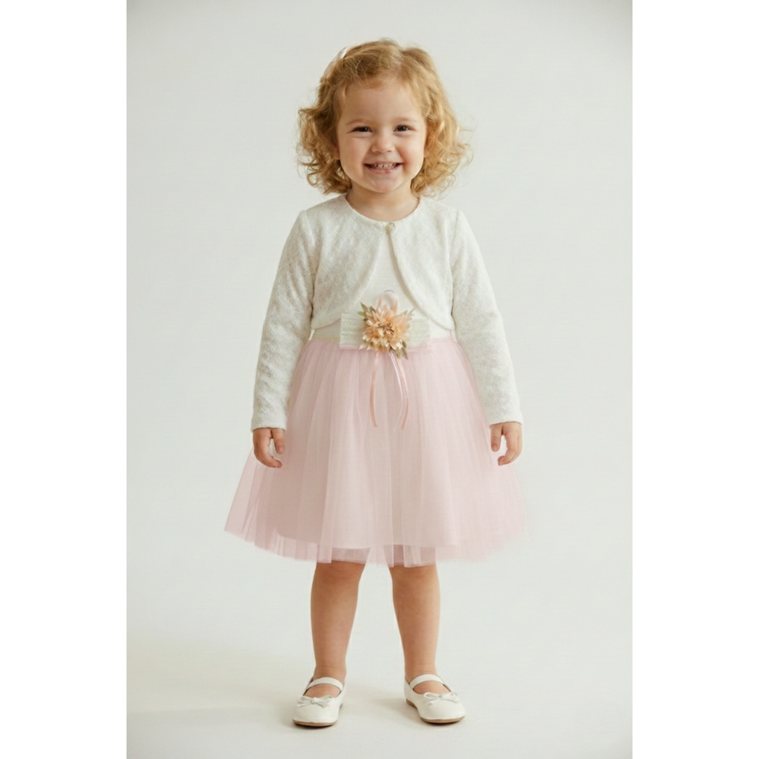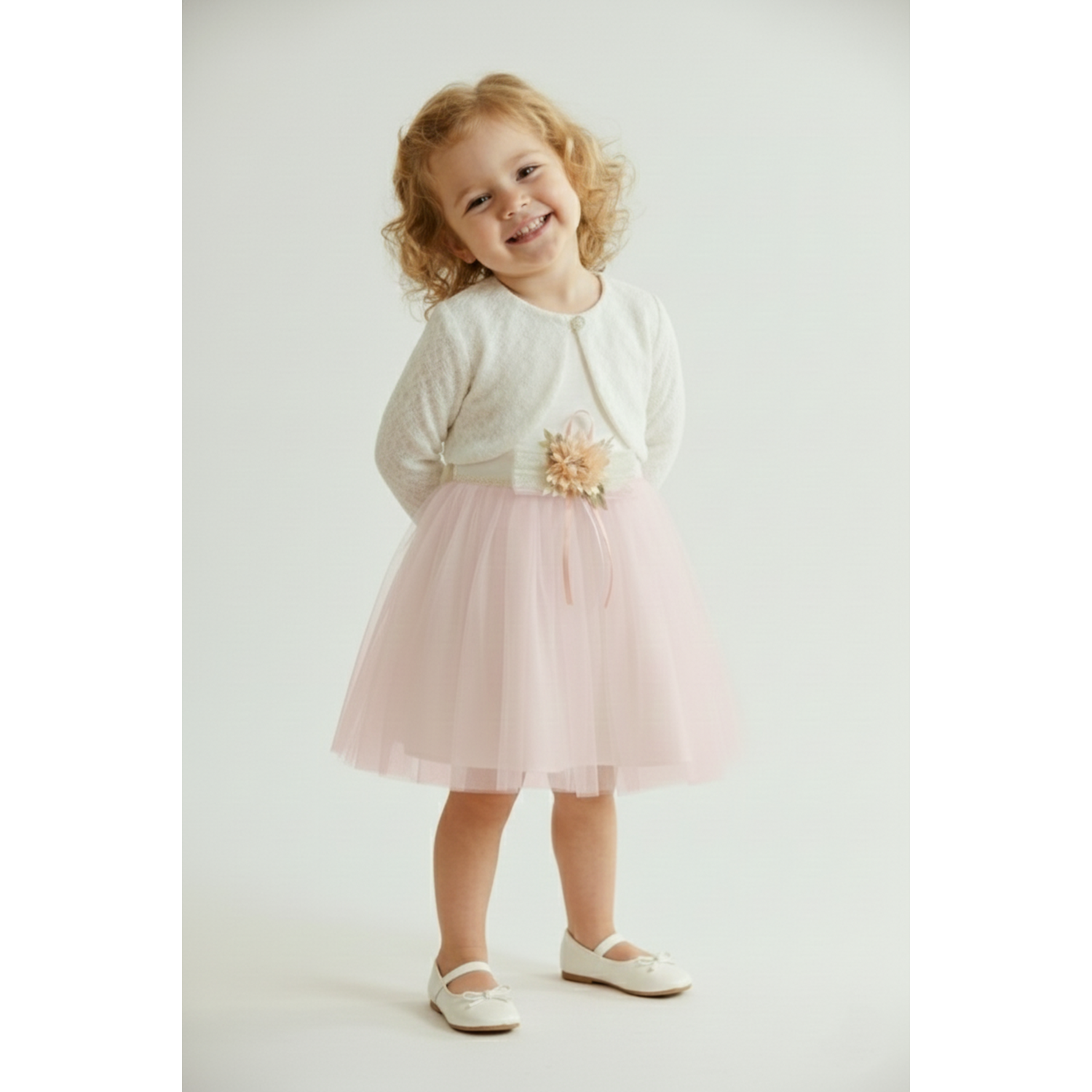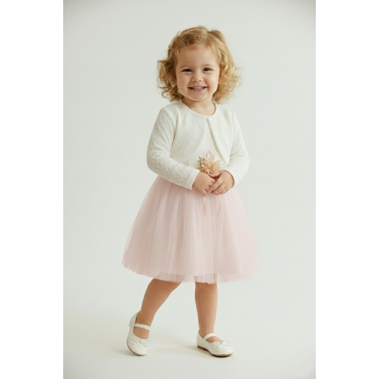 Şıklığı ve zarafeti bir arada sunan triko bolerolu kız bebek elbise modeli, minik prenseslerin özel günlerde parlaması için tasarlandı. Ekru renk elbisesi ve pudra tonlarında triko bolerosu ile zarif bir bütünlük oluşturan bu model, hem klasik hem modern bir görünüm sunar.