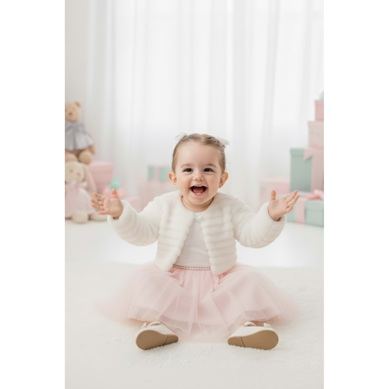 Üst Kısım: Yumuşak dokulu pelüş bolero, uzun kollu ve konforlu yapısıyla bebek cildine dosttur.