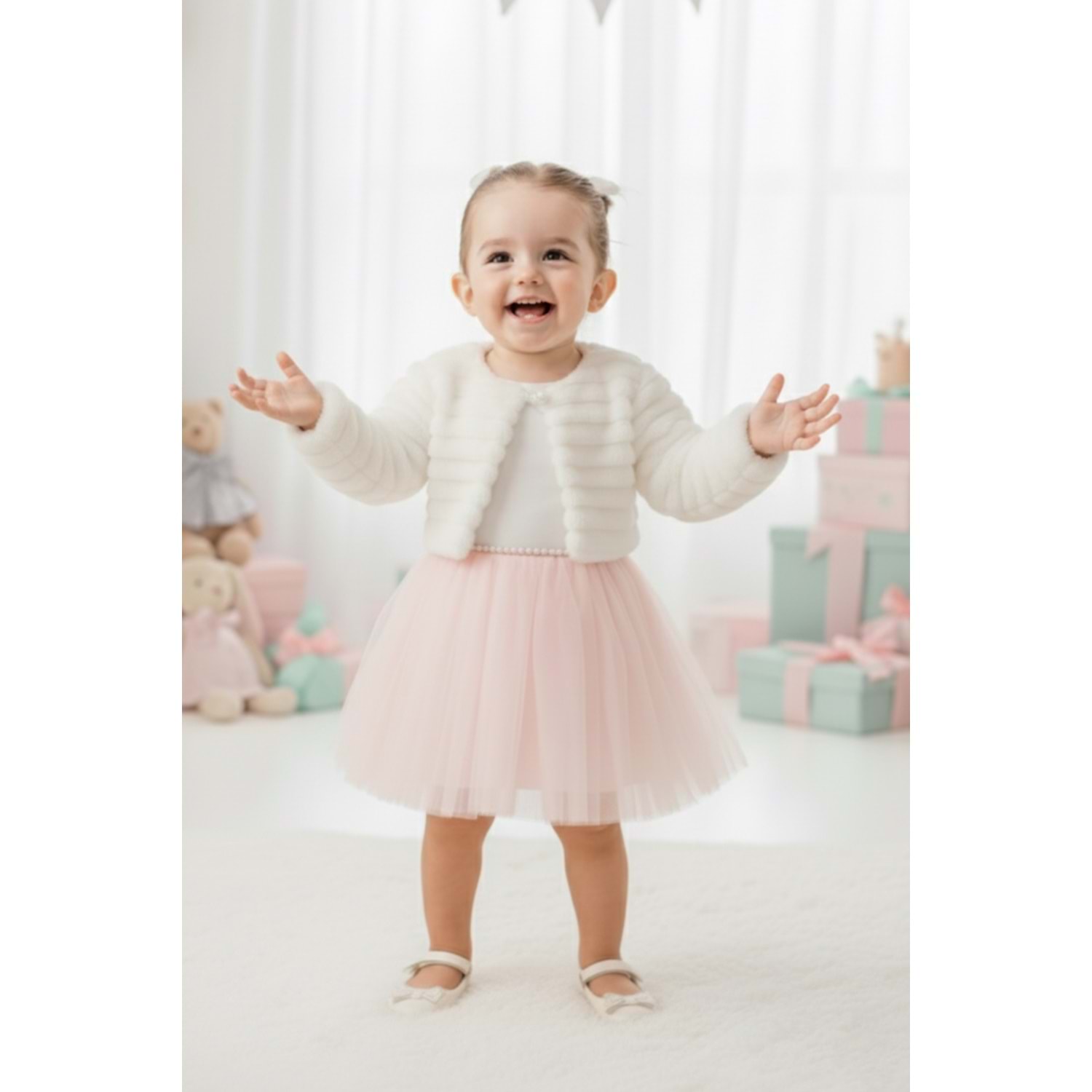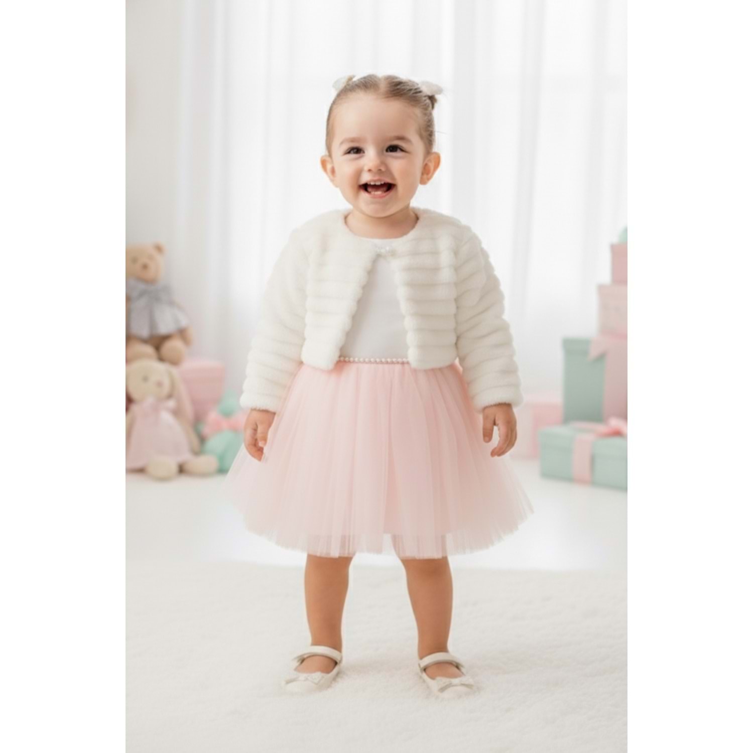 Pelüş bolerolu kız bebek elbise, hem konfor hem zarafet arayan ailelerin ilk tercihi. Her detayı özenle tasarlanmış bu özel kombin, bebeğinizin en anlamlı günlerinde unutulmaz bir şıklık sunar.