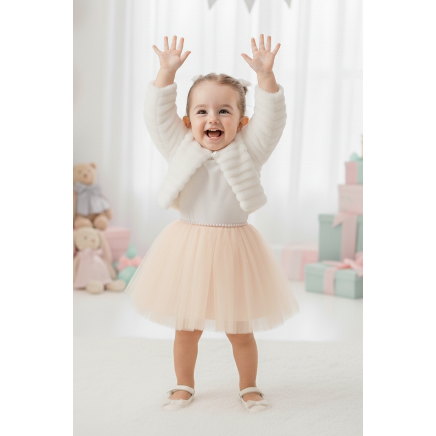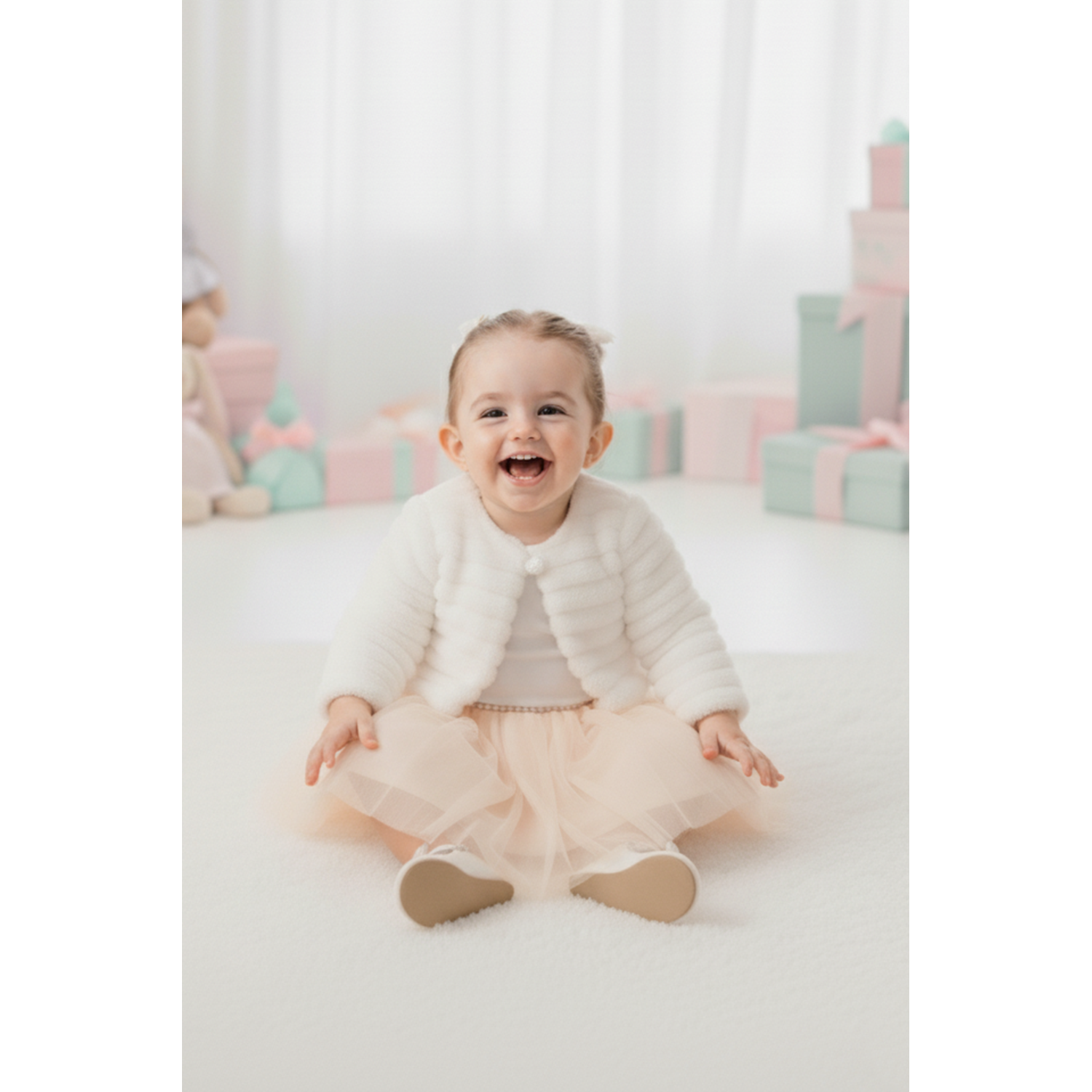 Pelüş bolerolu kız bebek elbise, hem konfor hem zarafet arayan ailelerin ilk tercihi. Her detayı özenle tasarlanmış bu özel kombin, bebeğinizin en anlamlı günlerinde unutulmaz bir şıklık sunar.