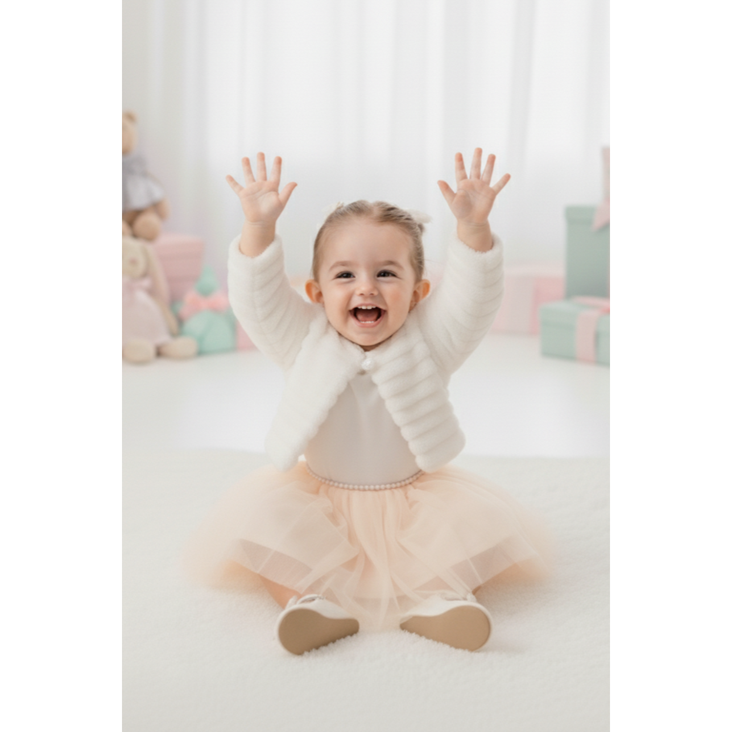 Üst Kısım: Yumuşak dokulu pelüş bolero, uzun kollu ve konforlu yapısıyla bebek cildine dosttur.