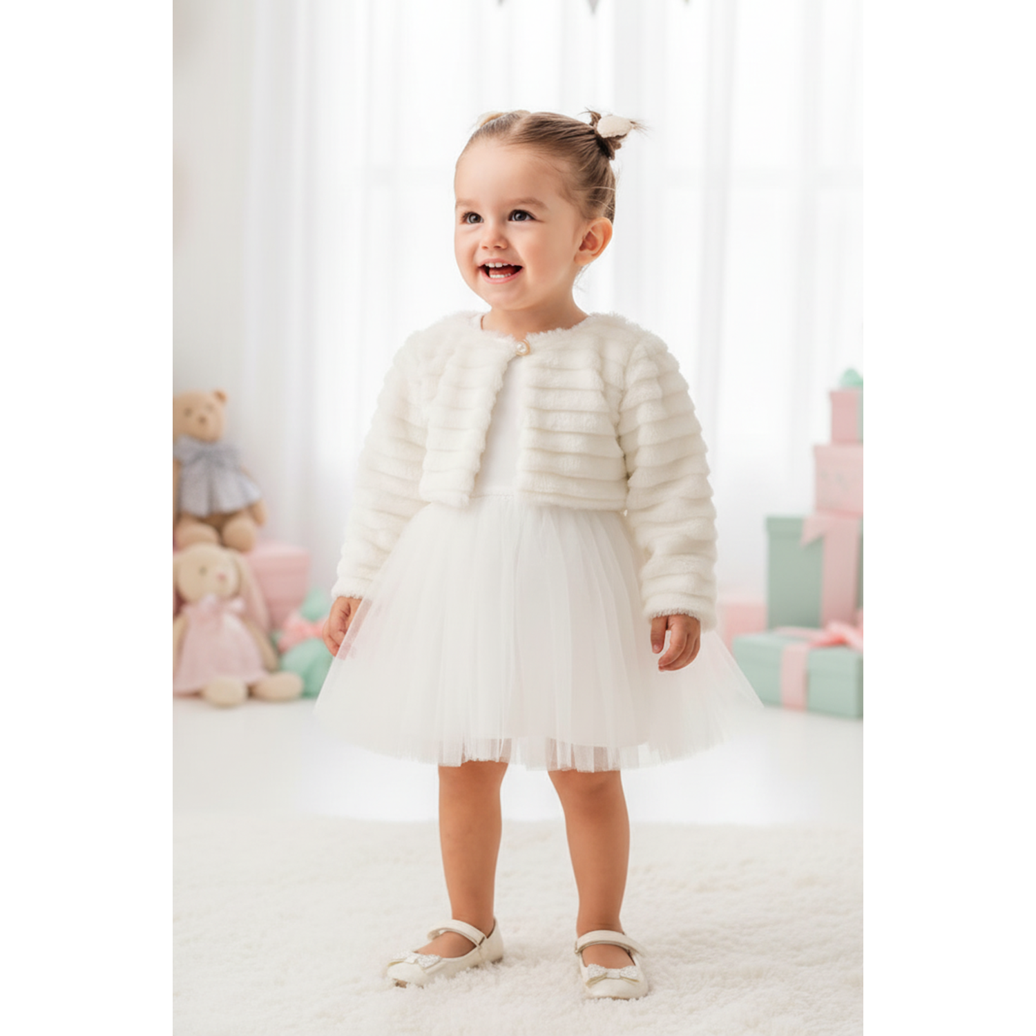 Üst Kısım: Yumuşak dokulu pelüş bolero, uzun kollu ve konforlu yapısıyla bebek cildine dosttur.