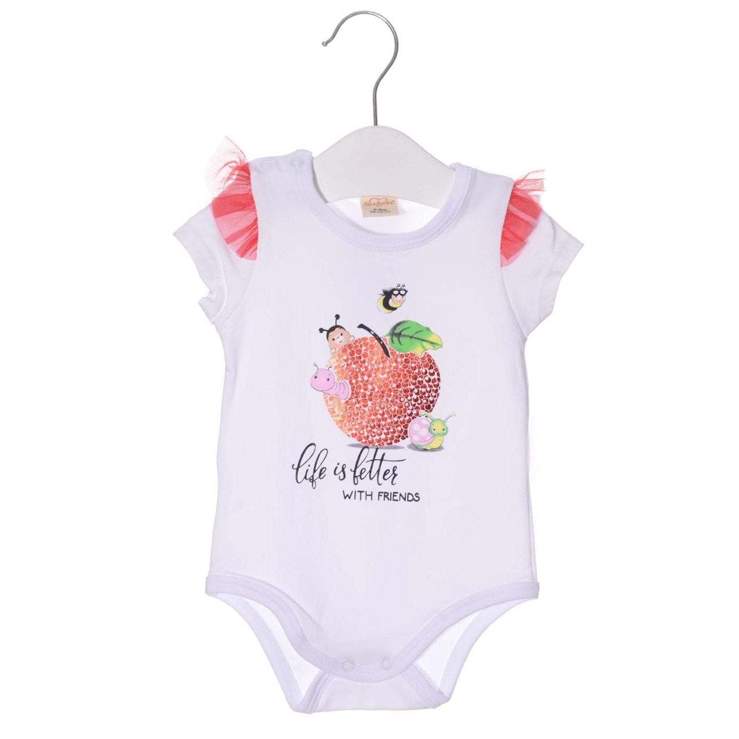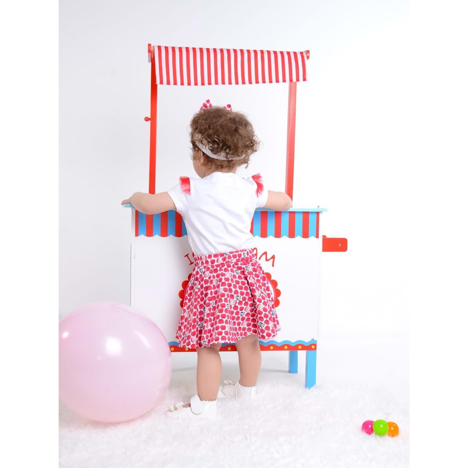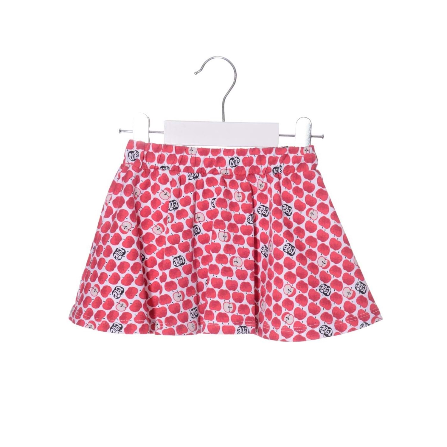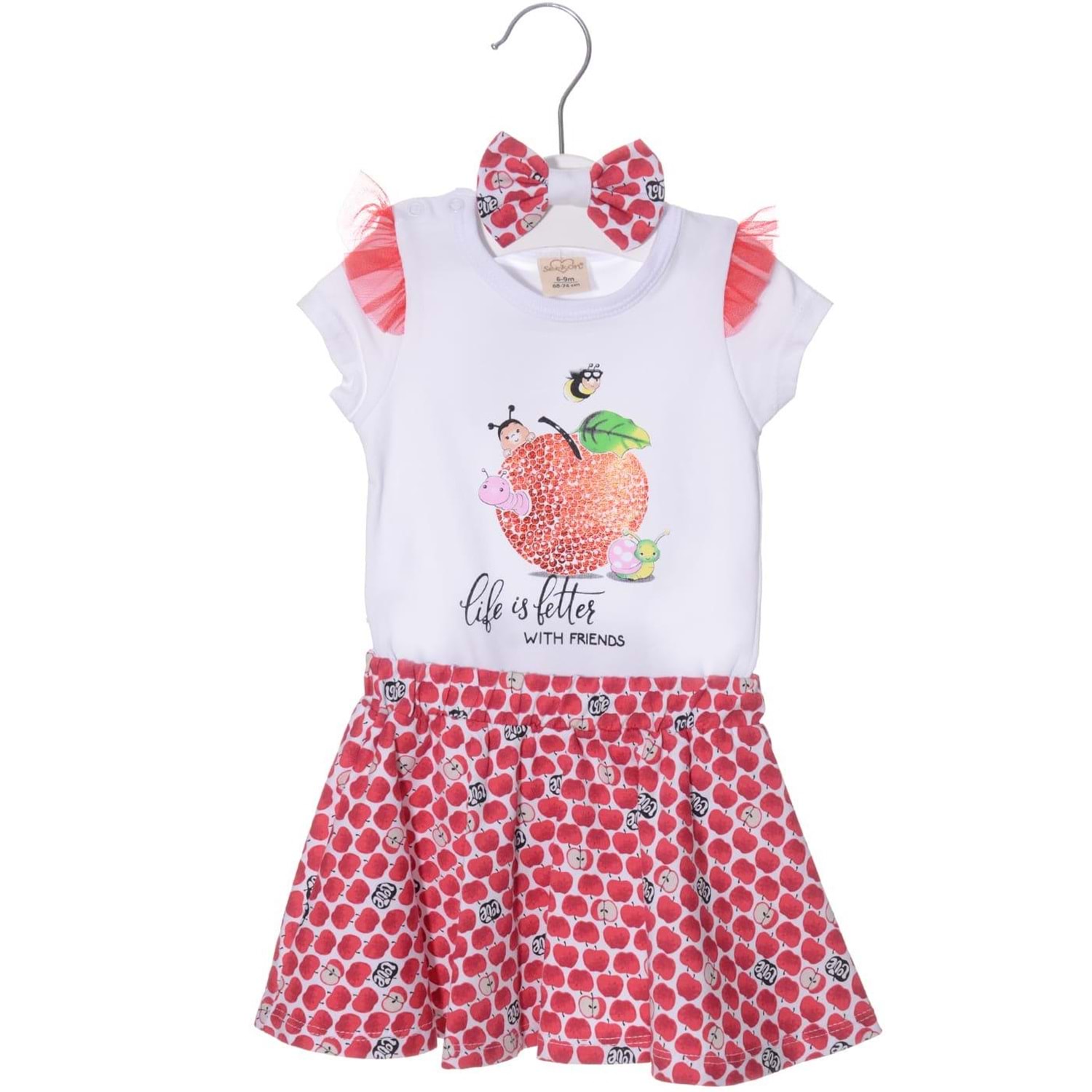 Çıtçıtlı badi , elma motifli etek ve bandanadan oluşan kombin.