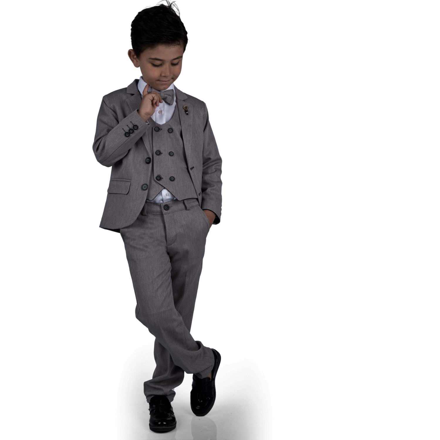 Gömlek, Pantolon, Yelek , Broş , Ceket ve Papyon olarak 6 parçadan oluşan Erkek Çocuk Damatlık Takım.