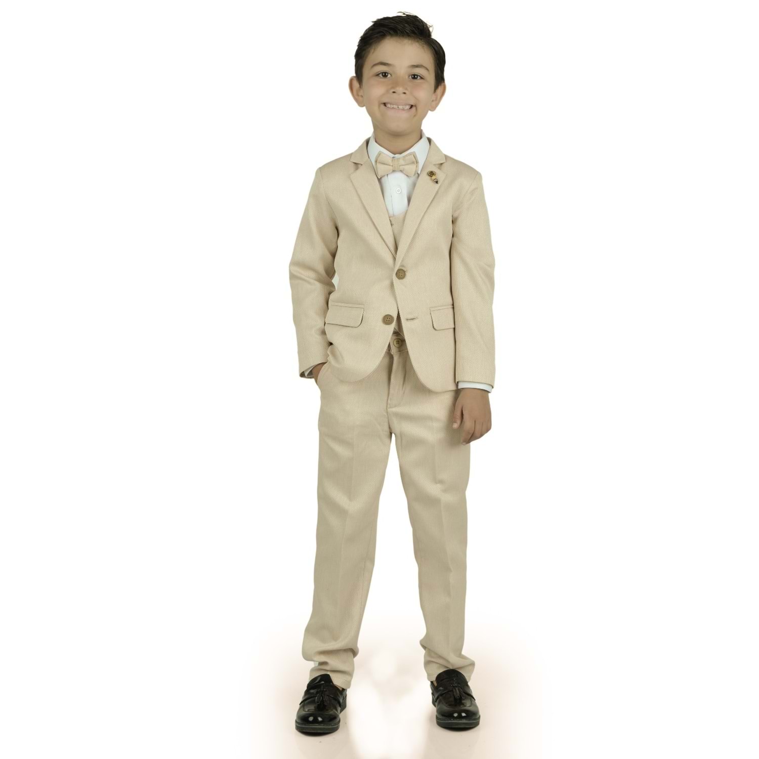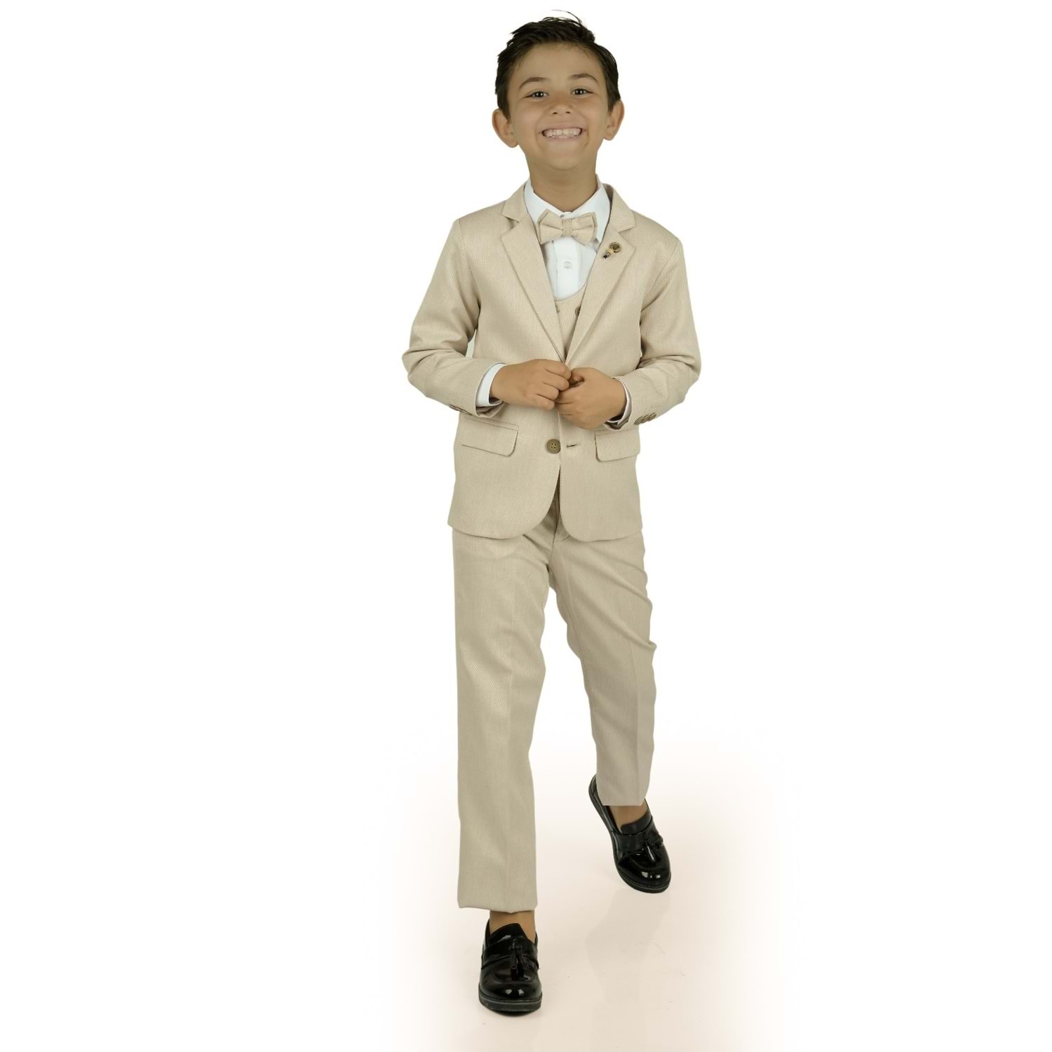 Gömlek, Pantolon, Yelek , Broş , Ceket ve Papyon olarak 6 parçadan oluşan Erkek Çocuk Damatlık Takım.