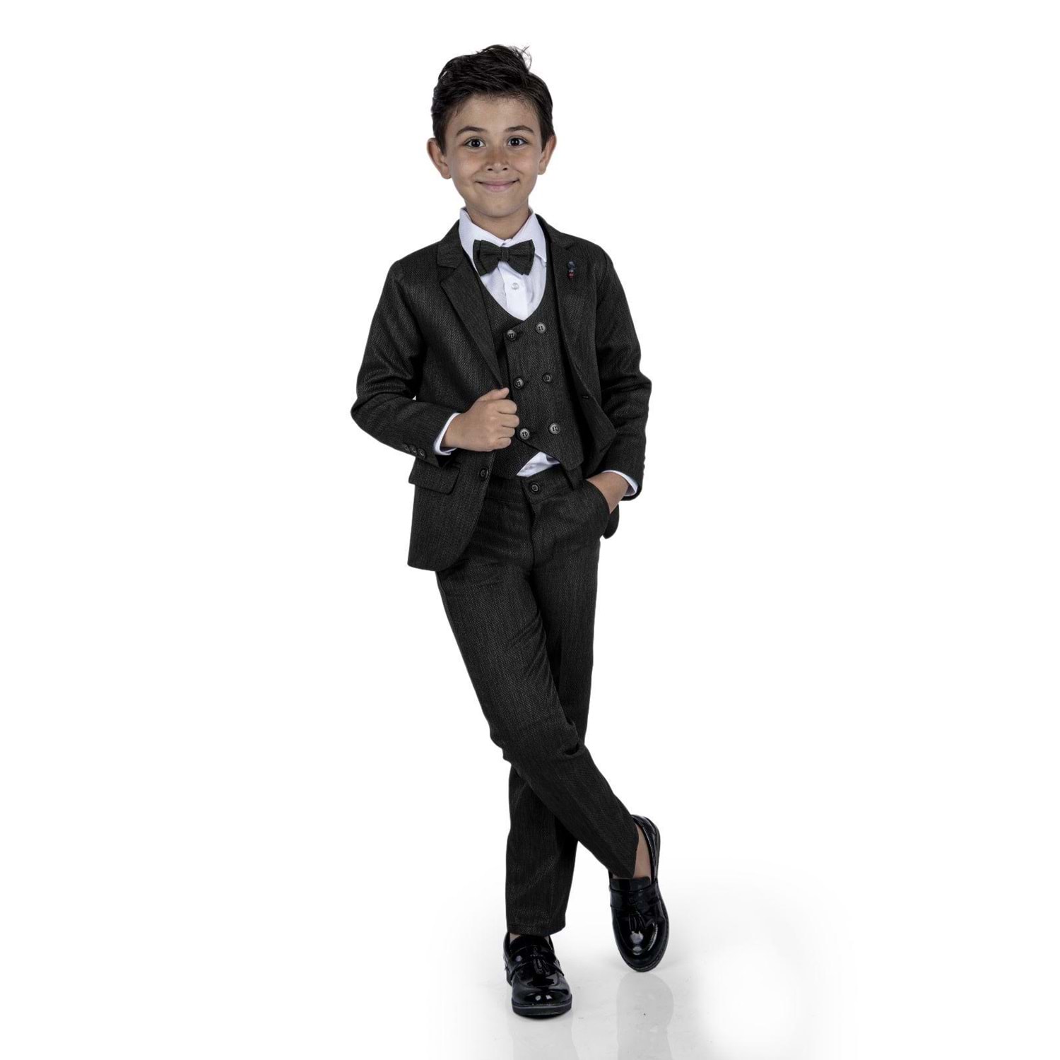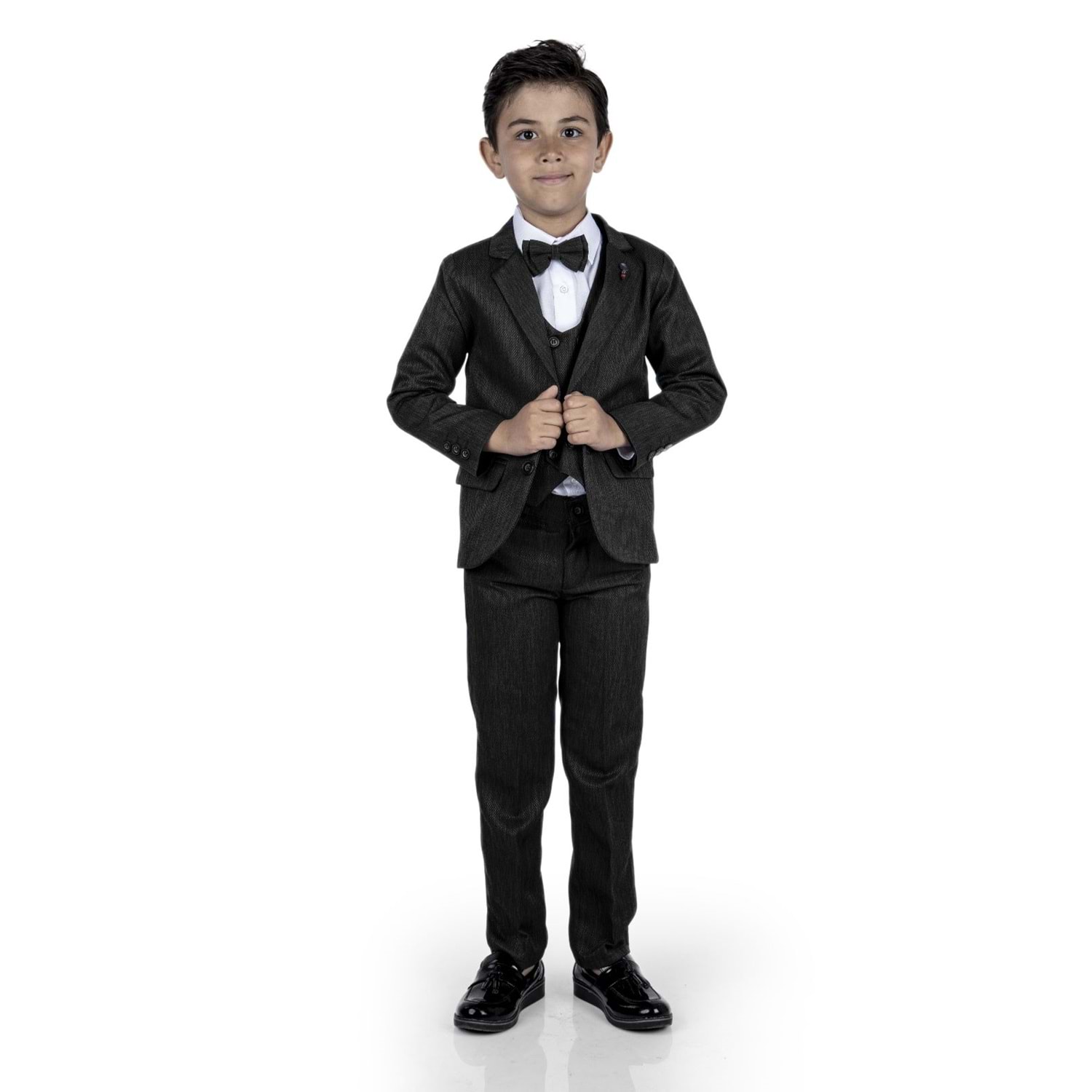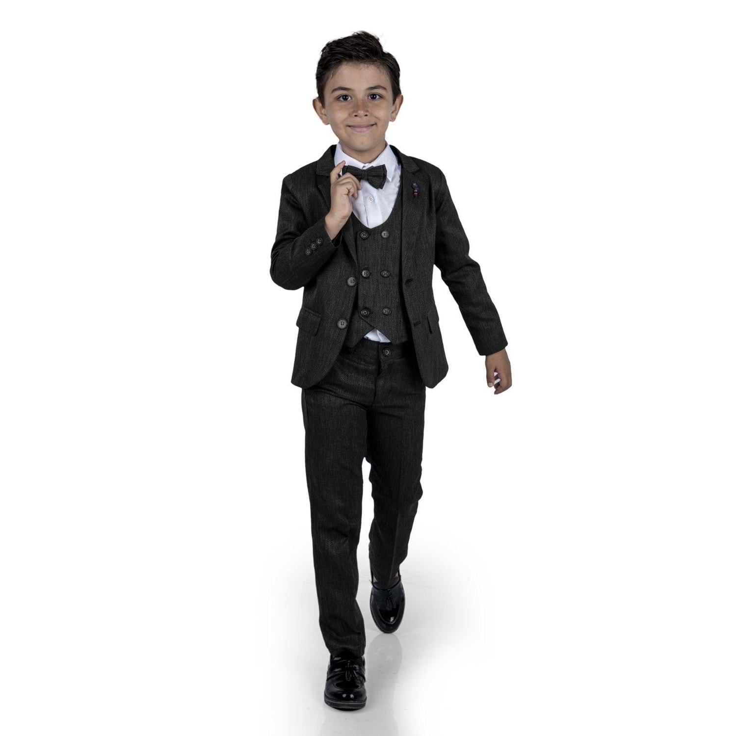 Gömlek, Pantolon, Yelek , Broş , Ceket ve Papyon olarak 6 parçadan oluşan Erkek Çocuk Damatlık Takım.