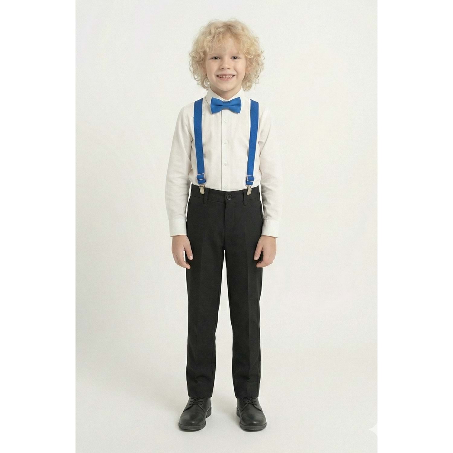 Şıklık ve konforu bir araya getiren bu dört parçalı çocuk takımı, düğün, nişan,23 nisan,çocuk bayramı, 19 mayıs, okuma bayramı, hatim merasimi, doğum günü, bayram, okul etkinlikleri ve fotoğraf çekimleri için ideal bir seçimdir. Set; siyah gabardin pantolon, beyaz gömlek, askı ve papyon ile birlikte gönderilir.