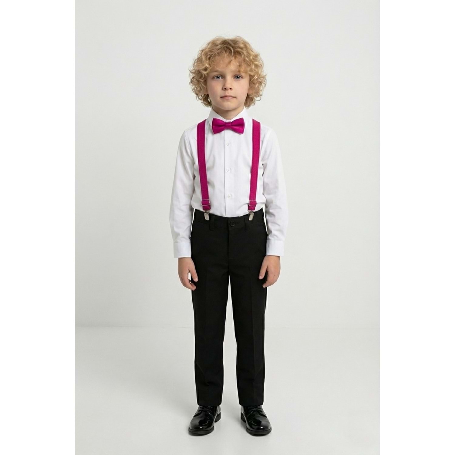 Şıklık ve konforu bir araya getiren bu dört parçalı çocuk takımı, düğün, nişan,23 nisan,çocuk bayramı, 19 mayıs, okuma bayramı, hatim merasimi, doğum günü, bayram, okul etkinlikleri ve fotoğraf çekimleri için ideal bir seçimdir. Set; siyah gabardin pantolon, beyaz gömlek, askı ve papyon ile birlikte gönderilir.
