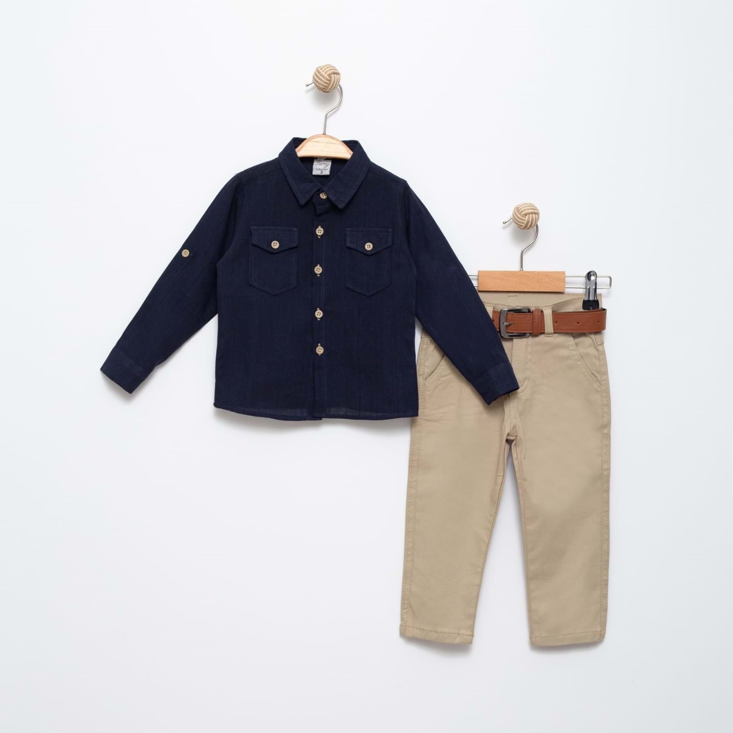 Katlamalı Kollu Gömlek Flamlı Keten Gömlek ,Gabardin Uzun Pantolondan oluşan Erkek Çocuk Takım .