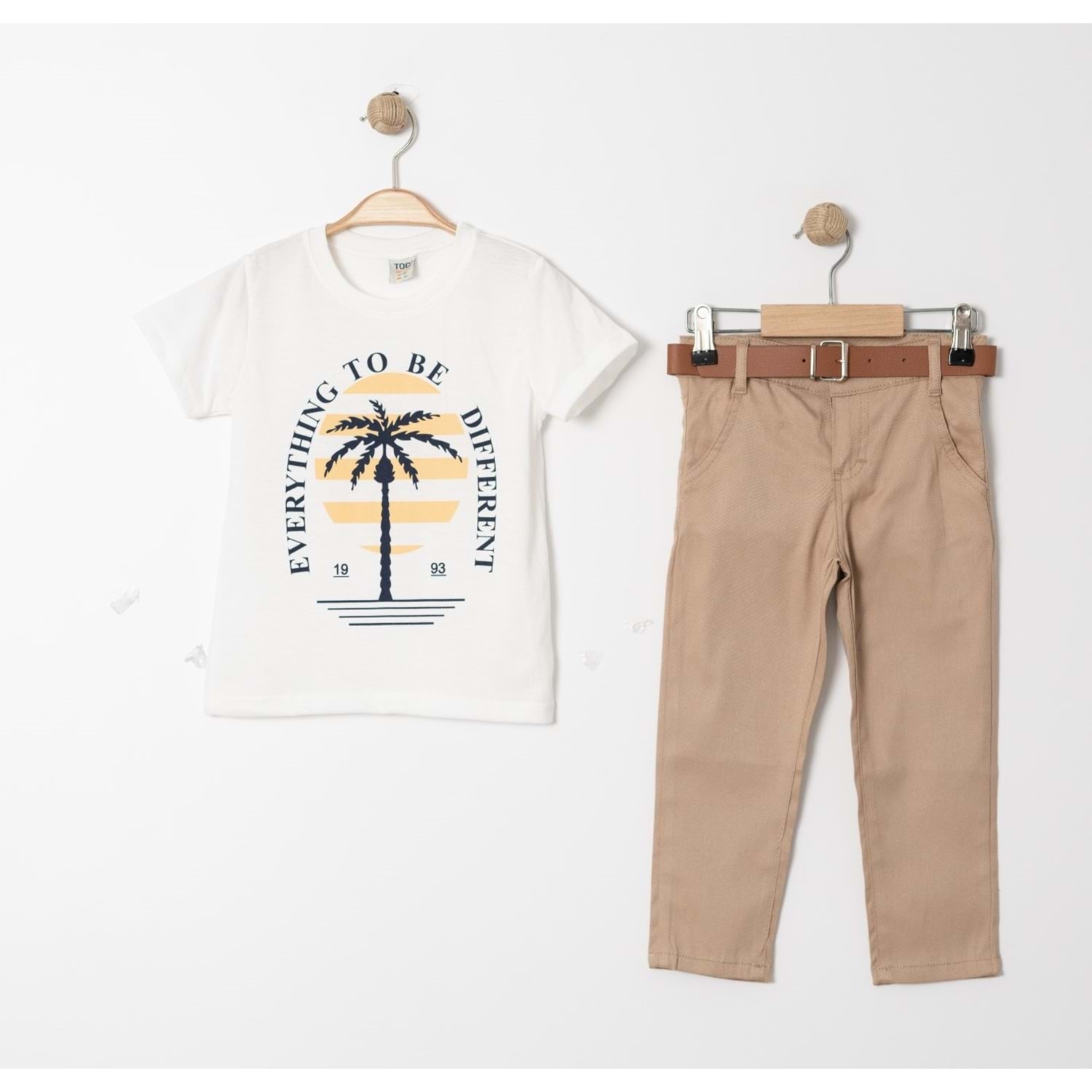 Katlamalı Kollu Gömlek , Kısa Kollu Tişört ve Gabardin Uzun Pantolondan oluşan 3 parça Kemerli Erkek Çocuk Takım .