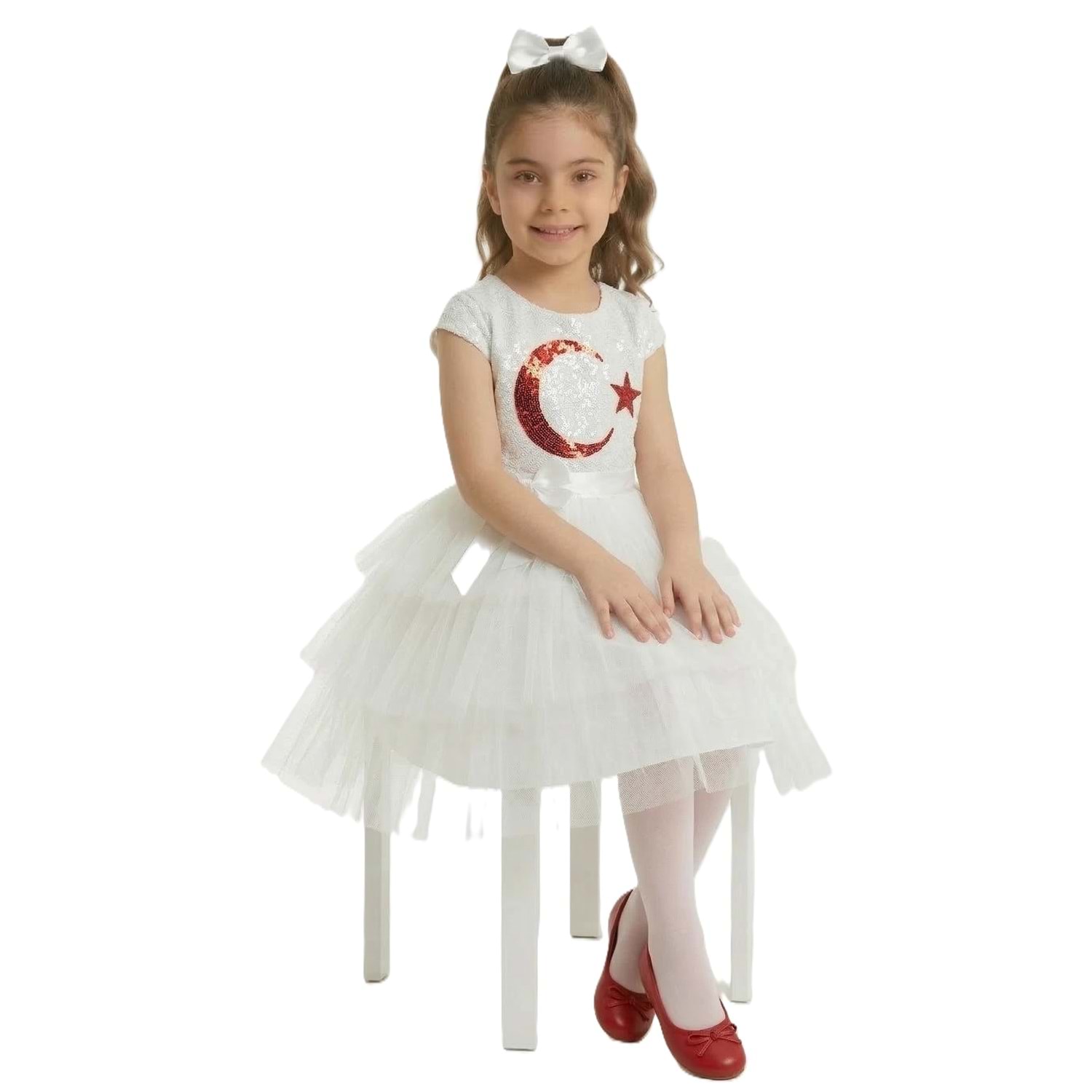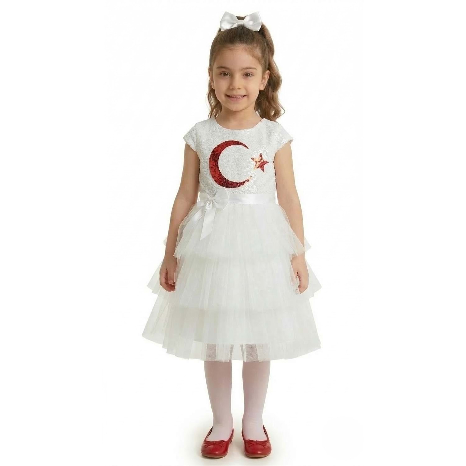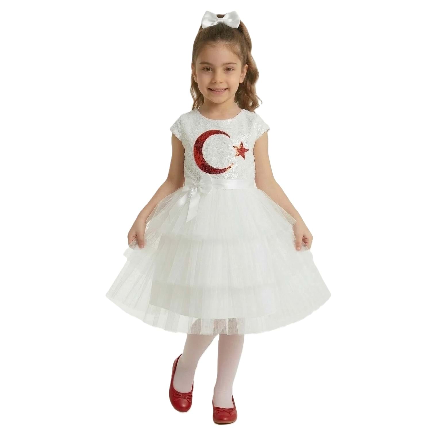Çocuklarımızın en özel günlerinde, onların heyecanına ve coşkusuna ortak olacak muhteşem bir tasarımla karşınızdayız! Pul Payetli Ay Yıldızlı Kız Çocuk Elbisesi, hem şıklığı hem de taşıdığı anlamla göz kamaştırıyor. Kırmızı ve beyaz renk seçenekleriyle sunduğumuz bu özel tasarım, minik prenseslerin bayram sevincini ikiye katlayacak.