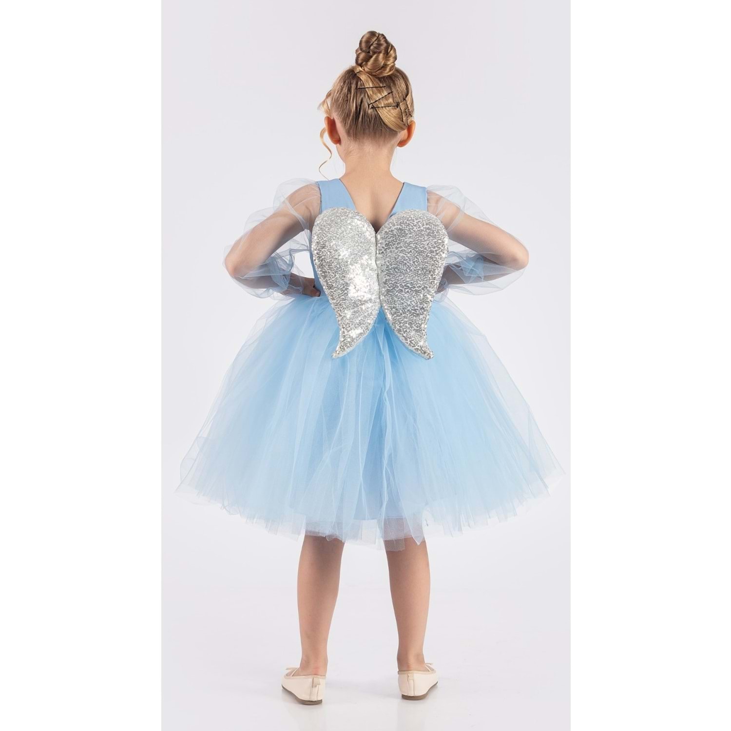 Özel günlerde miniklerin hayallerini süsleyen kanatlı pul payet detaylı tül kız çocuk abiye elbise, şık tasarımı ve konforlu yapısıyla dikkat çeker. Doğum günü, parti ve özel davetlerde zarif bir görünüm sunar.