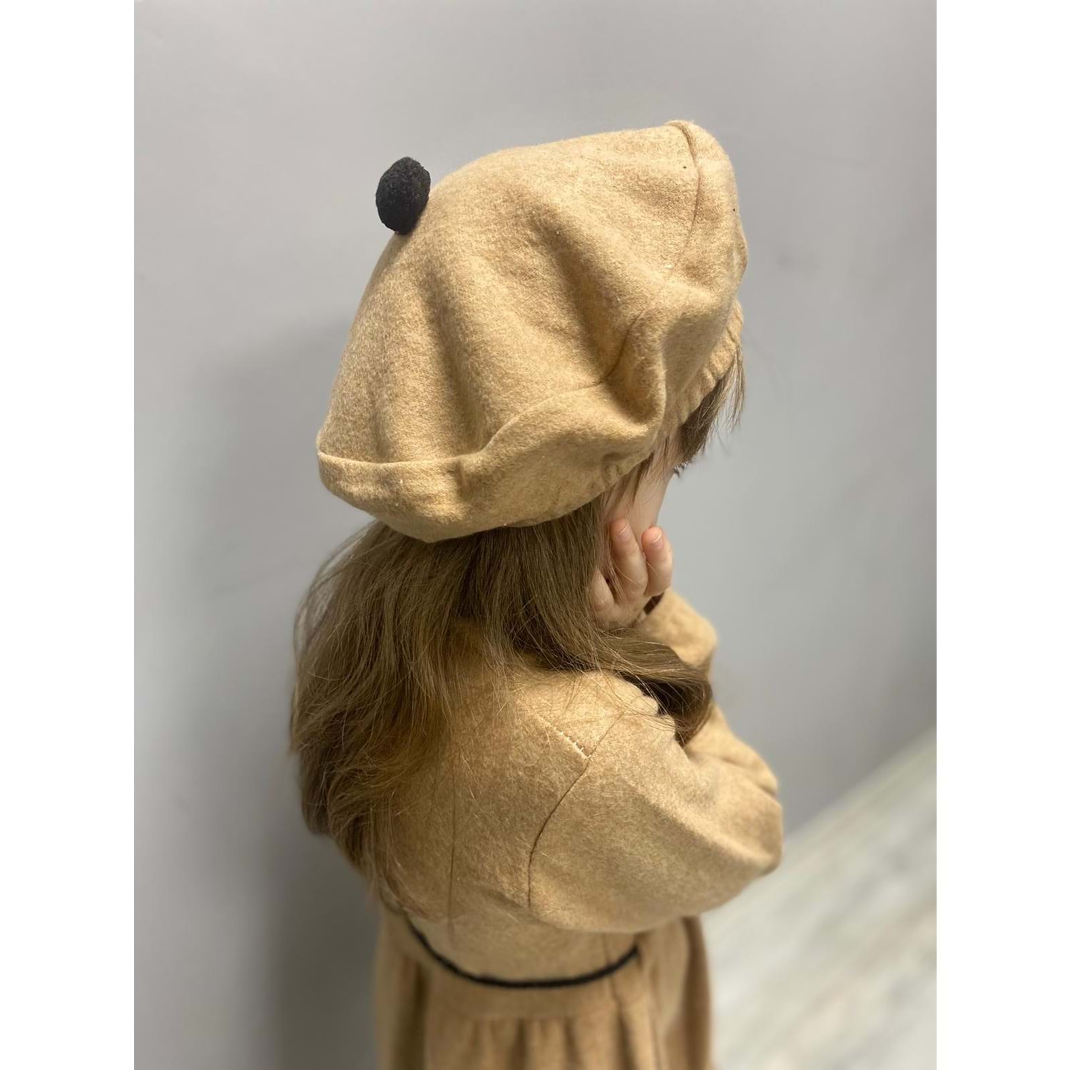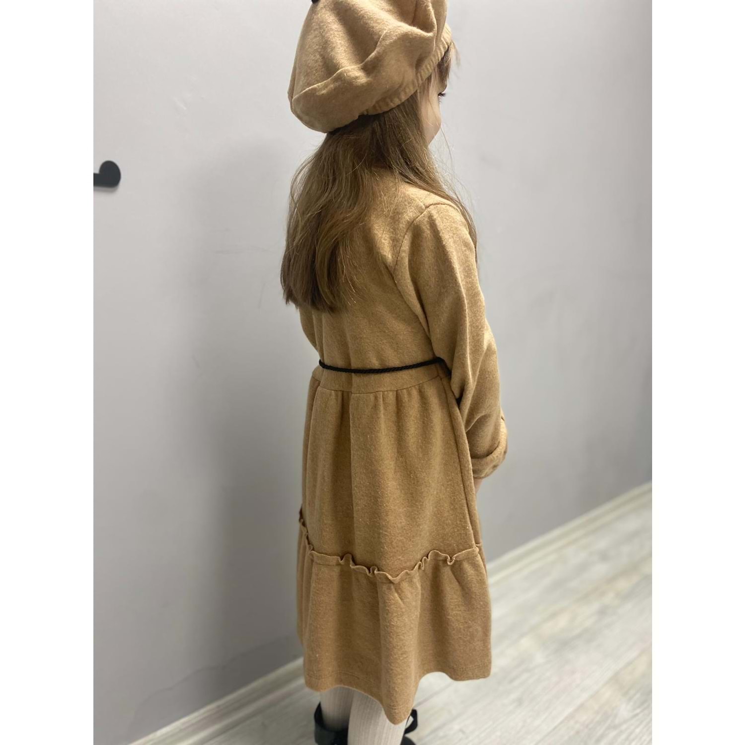 Kaşe kumaştan üretilmiş şapka ve elbise olarak iki parçadan oluşan beli ip aksesuarlı kışlık çocuk uzun kollu elbise.