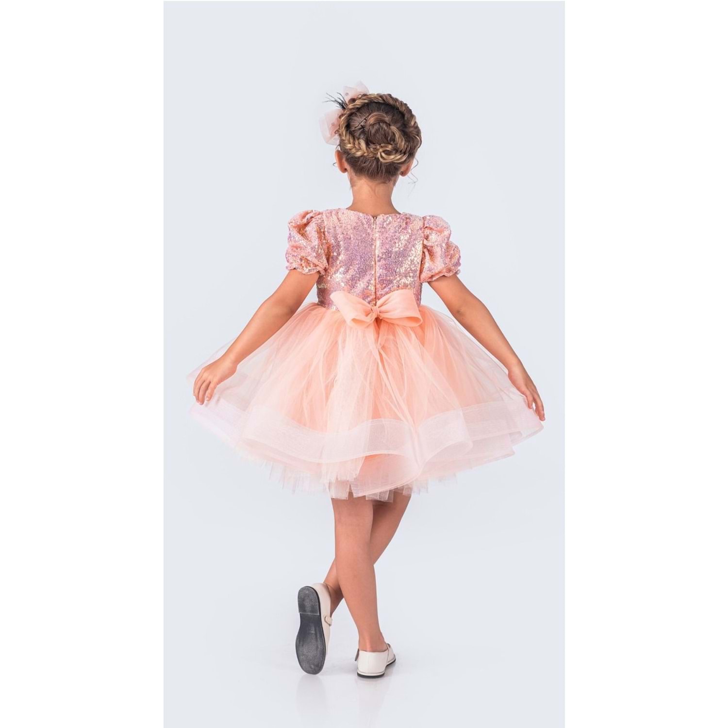 Beden kalıp ölçüleri standartlara uygundur. Alt kısım pamuk astar destekli. Sırt fermuarlı. Tül kumaş ve gren ile kabartılmıştır.