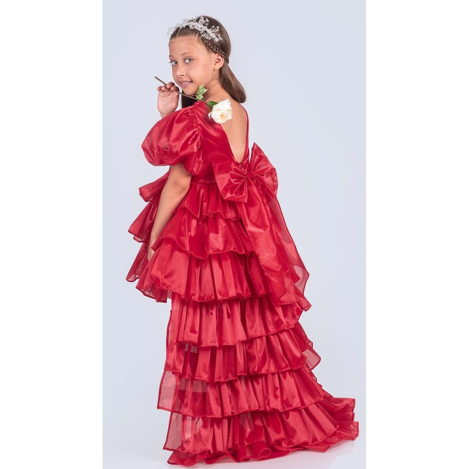 Bel kısmından başlayan kat kat tül detayları eteğe hacim kazandırır. Kabarık balon kollar ise prenses temalı davetlerin vazgeçilmez tamamlayıcısıdır. İç astarlı yapısı çocuğunuzun cildini korur, hafif ve esnek kumaşı maksimum hareket özgürlüğü sağlar. Kat kat hacimli tül etek detayı, prenses konseptli balon kollar ve çıkarılabilir kuyruk özelliğiyle bu kız çocuk abiye elbise, özel günlerin yıldızı olmak isteyen minik prensesler için mükemmel bir tercihtir. Taşlı taç aksesuarı ile tamamlanan bu şık tasarım; düğün, doğum günü, mezuniyet gibi unutulmaz anlar için benzersiz bir seçimdir.