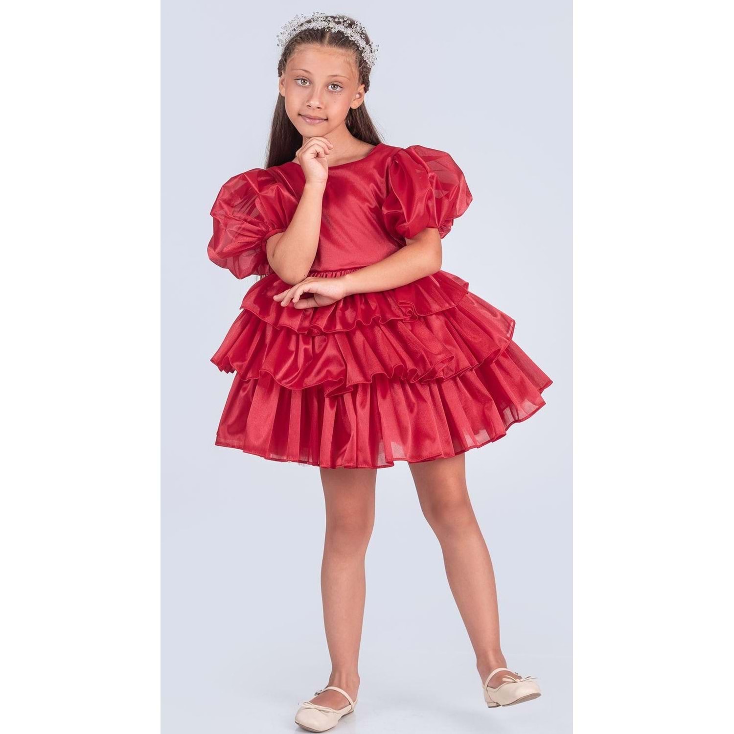 Kumaş: Parlak, hafif ve kabarık organze – kat kat volanlı görünüm için ideal