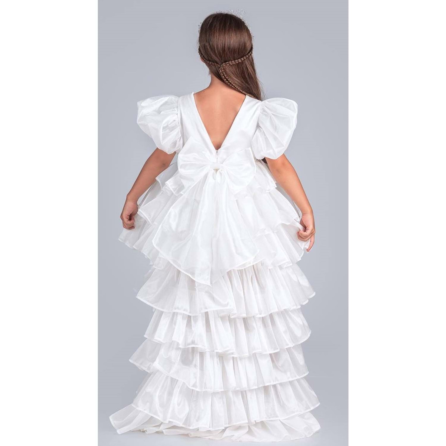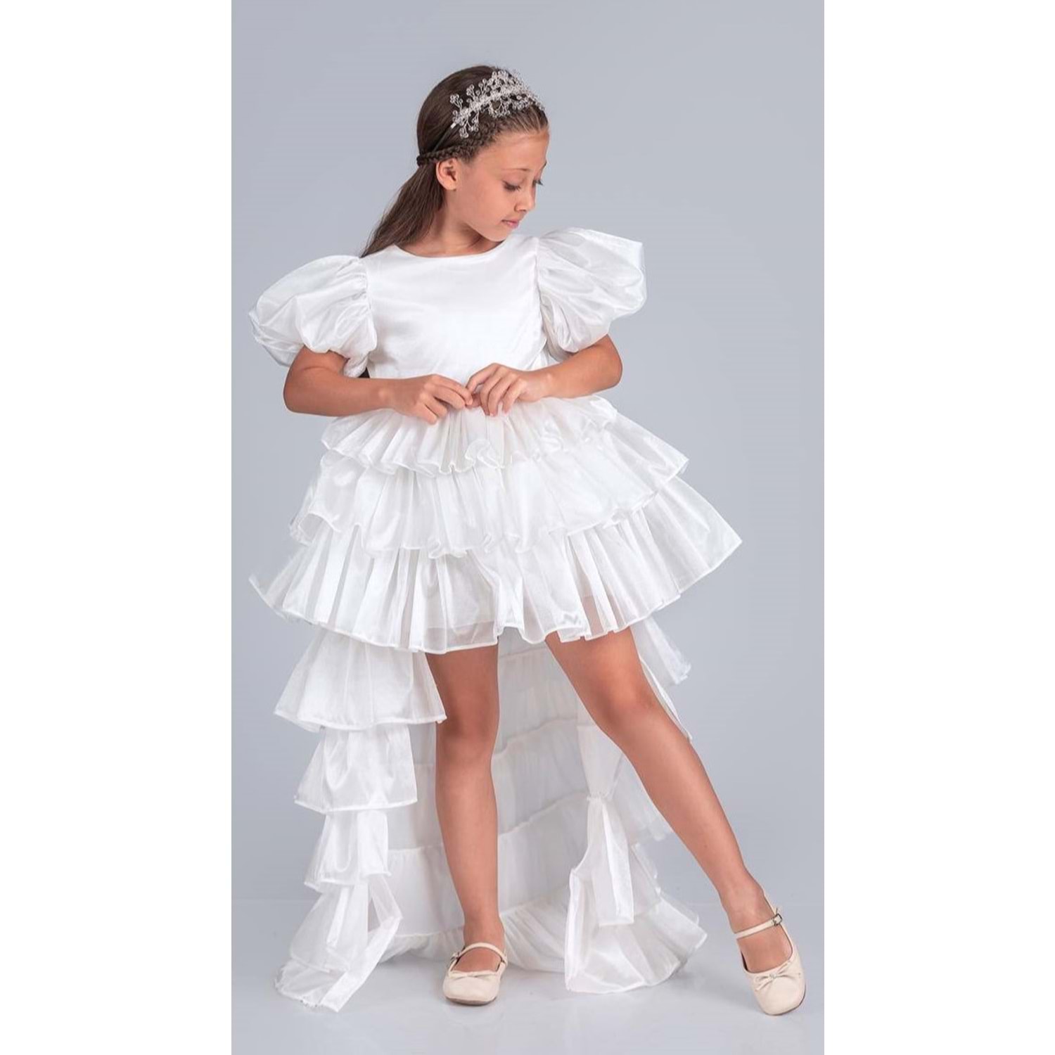 Her özel günü unutulmaz kılacak bu kız çocuk abiye elbise, beyaz rengi ve etkileyici tasarımıyla prenses hayalini gerçeğe dönüştürür. Yüksek kaliteli parlak organze kumaştan üretilen elbise, kabarık balon kol detayı ve kat kat hacimli etek yapısı ile dikkat çeker. Ürüne dahil olan taşlı taç aksesuarı sayesinde kombini tamamlayarak göz alıcı bir şıklık sunar.