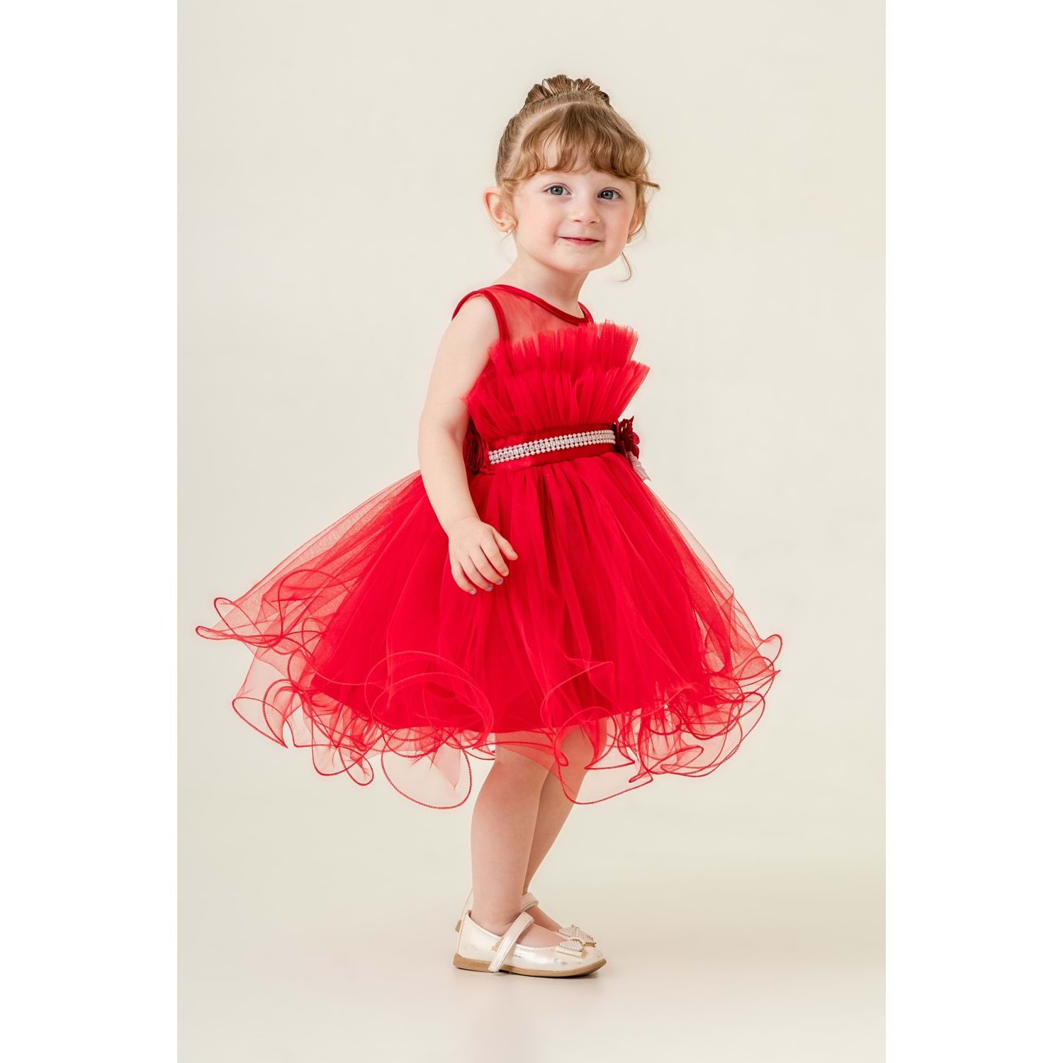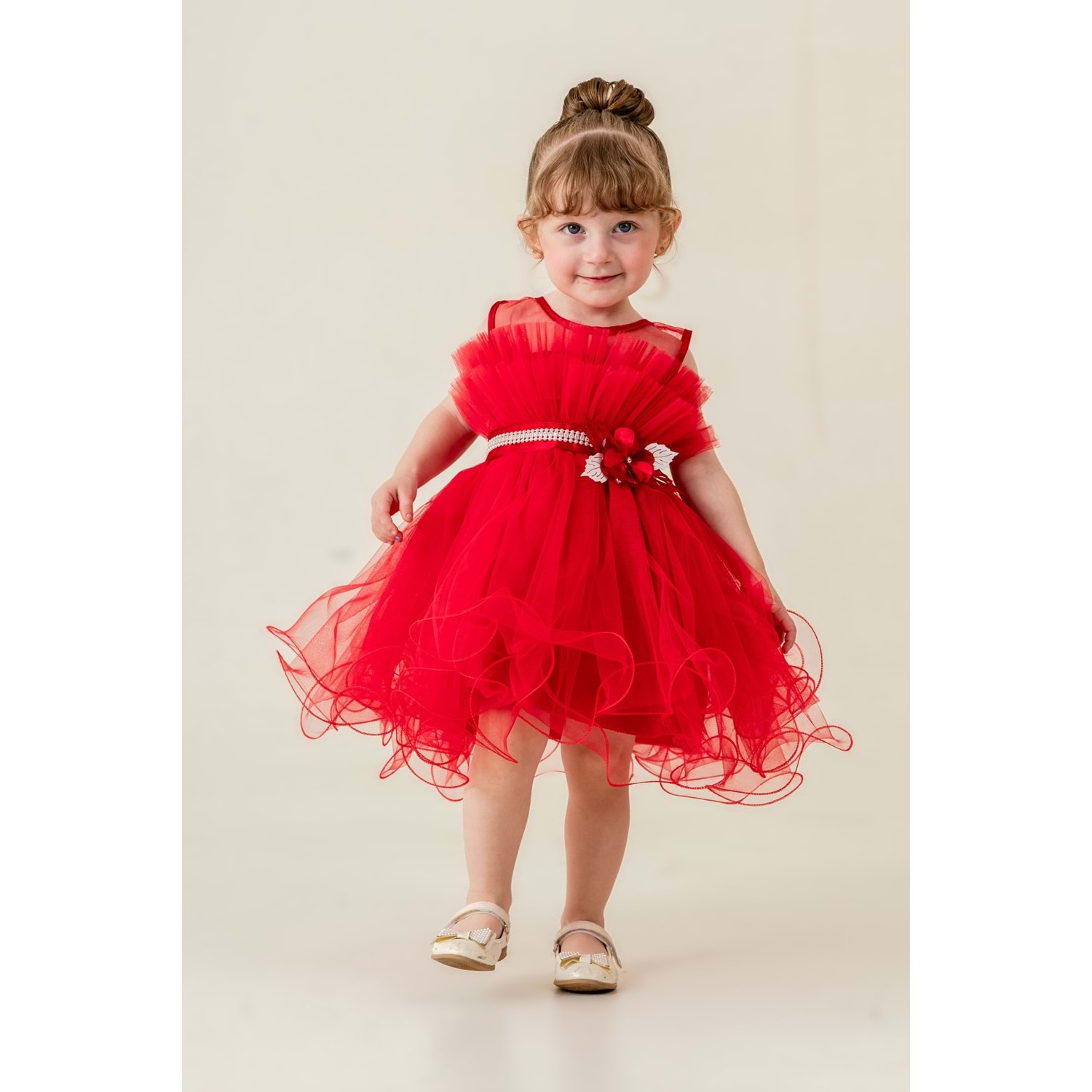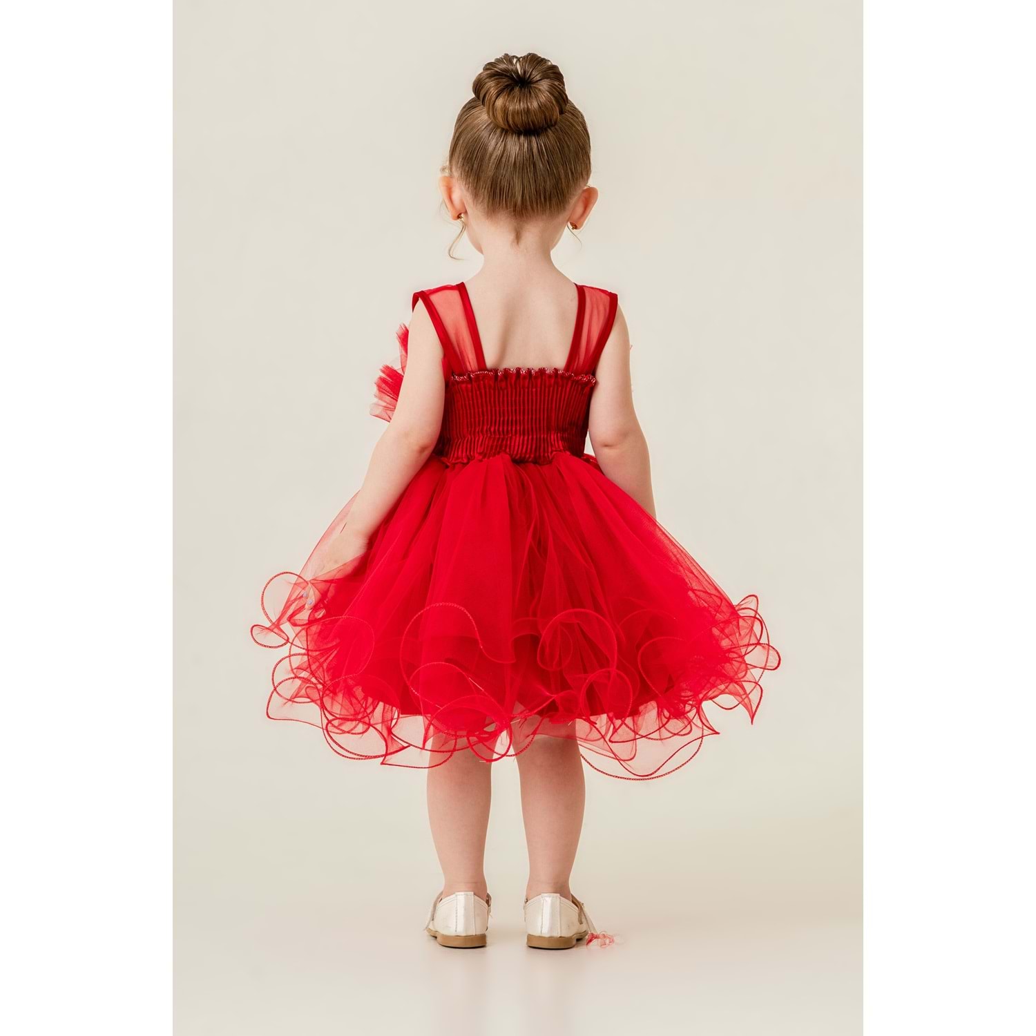 Beden kalıp ölçüleri standartlara uygundur. Alt kısım pamuk astar destekli. Sırt fermuarlı. Tül kumaş ile kabartılmıştır.