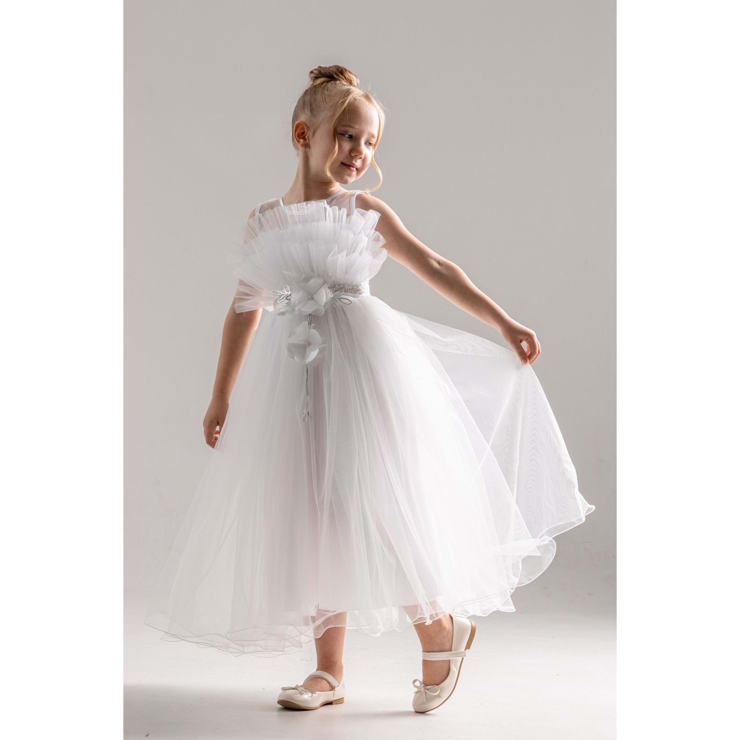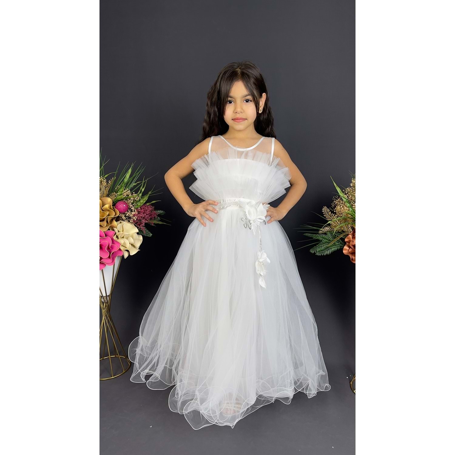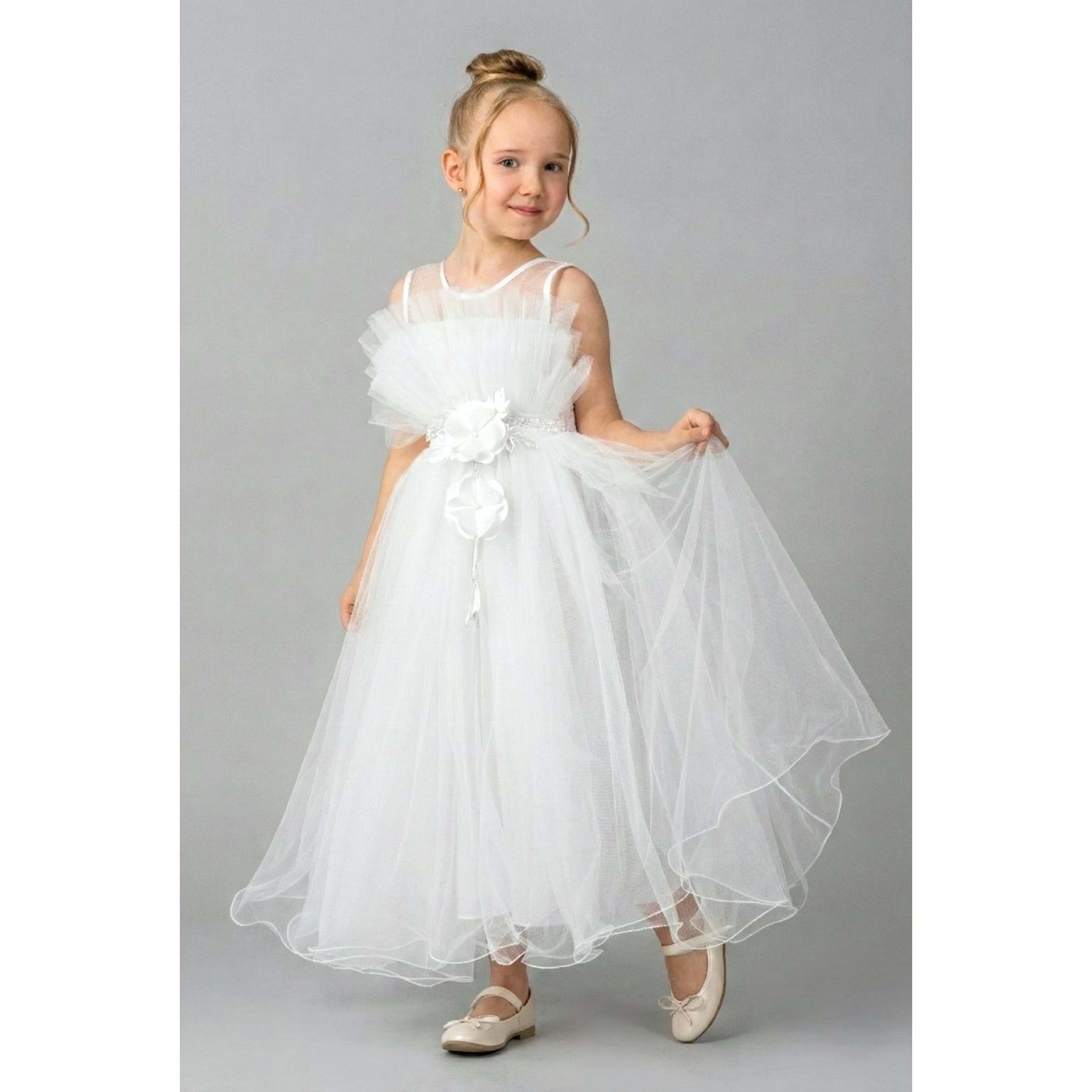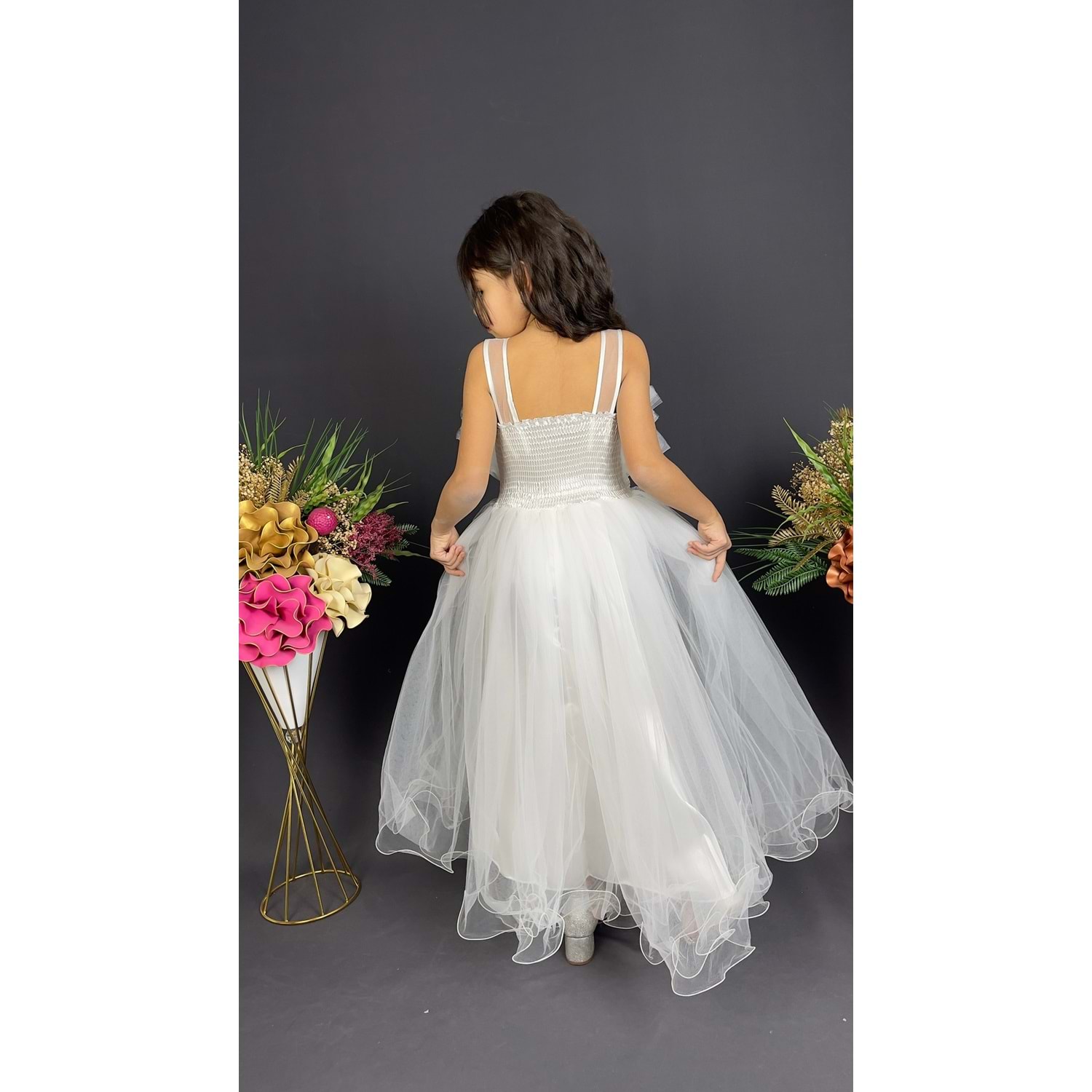 Minik prensesler için tasarlanmış robasi katlı özel gün abiye elbise, sırt kısmı gipe lastikli ve uzun etek alt kısmı astarlıdır. Düğün, mezuniyet, doğum günü veya özel günlerde rahat ve şık bir kullanım sağlar.