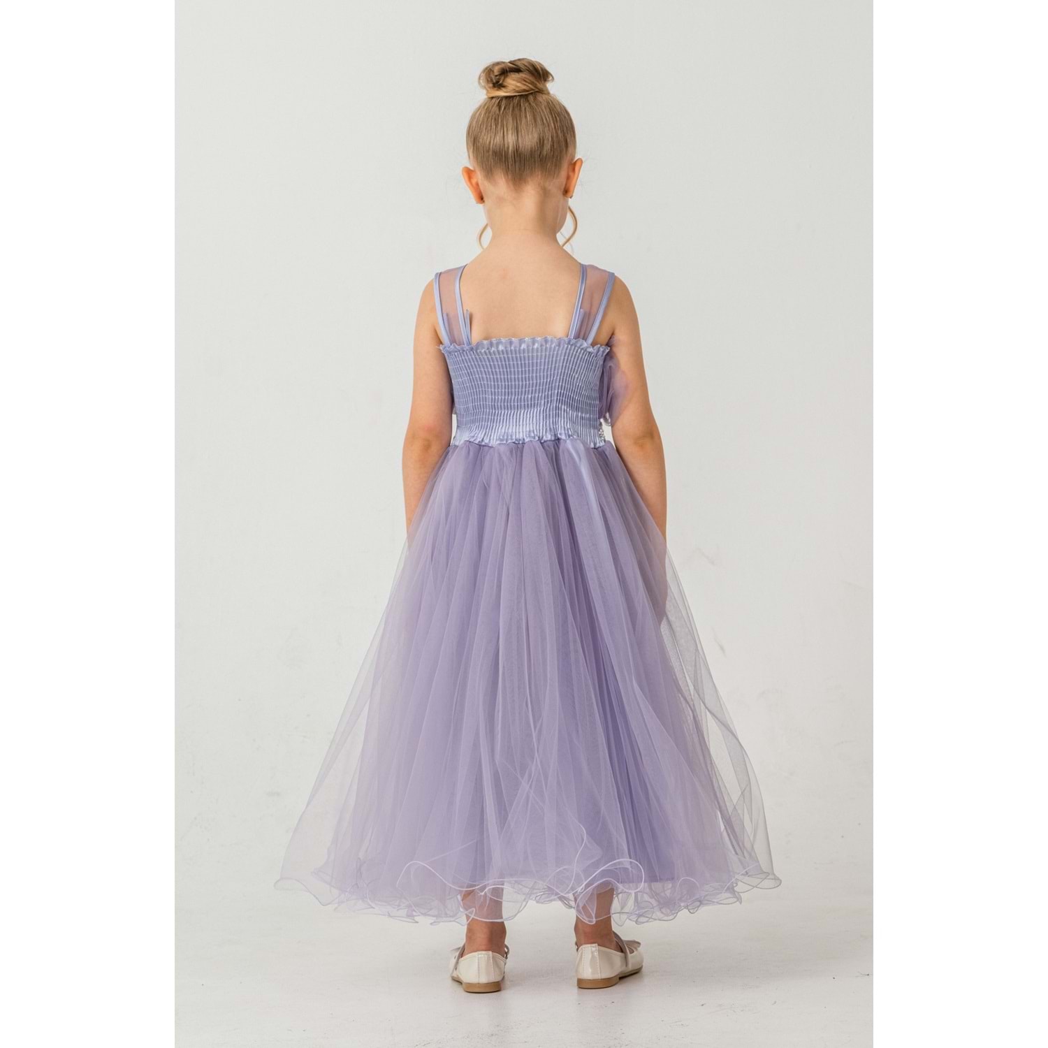 Minik prensesler için tasarlanmış robasi katlı özel gün abiye elbise, sırt kısmı gipe lastikli ve uzun etek alt kısmı astarlıdır. Düğün, mezuniyet, doğum günü veya özel günlerde rahat ve şık bir kullanım sağlar.
