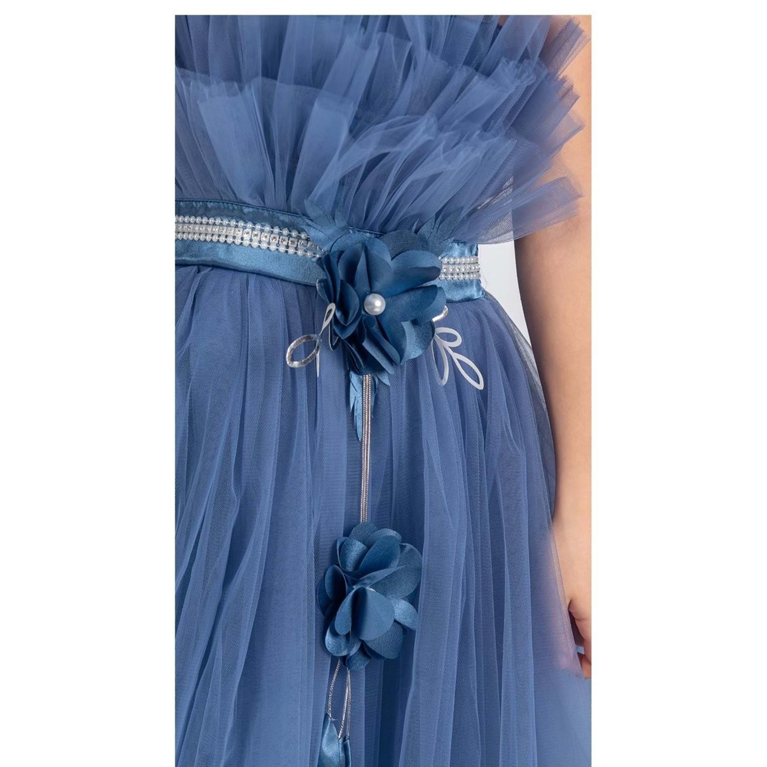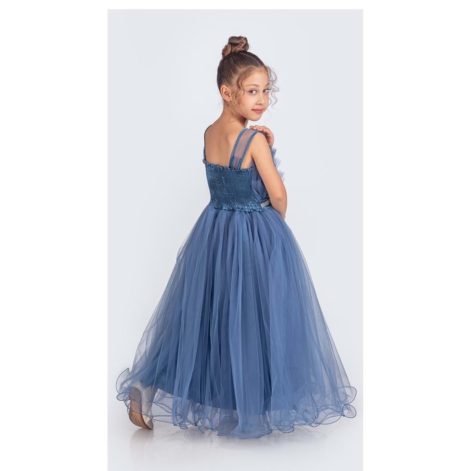 Minik prensesler için tasarlanmış robasi katlı özel gün abiye elbise, sırt kısmı gipe lastikli ve uzun etek alt kısmı astarlıdır. Düğün, mezuniyet, doğum günü veya özel günlerde rahat ve şık bir kullanım sağlar.