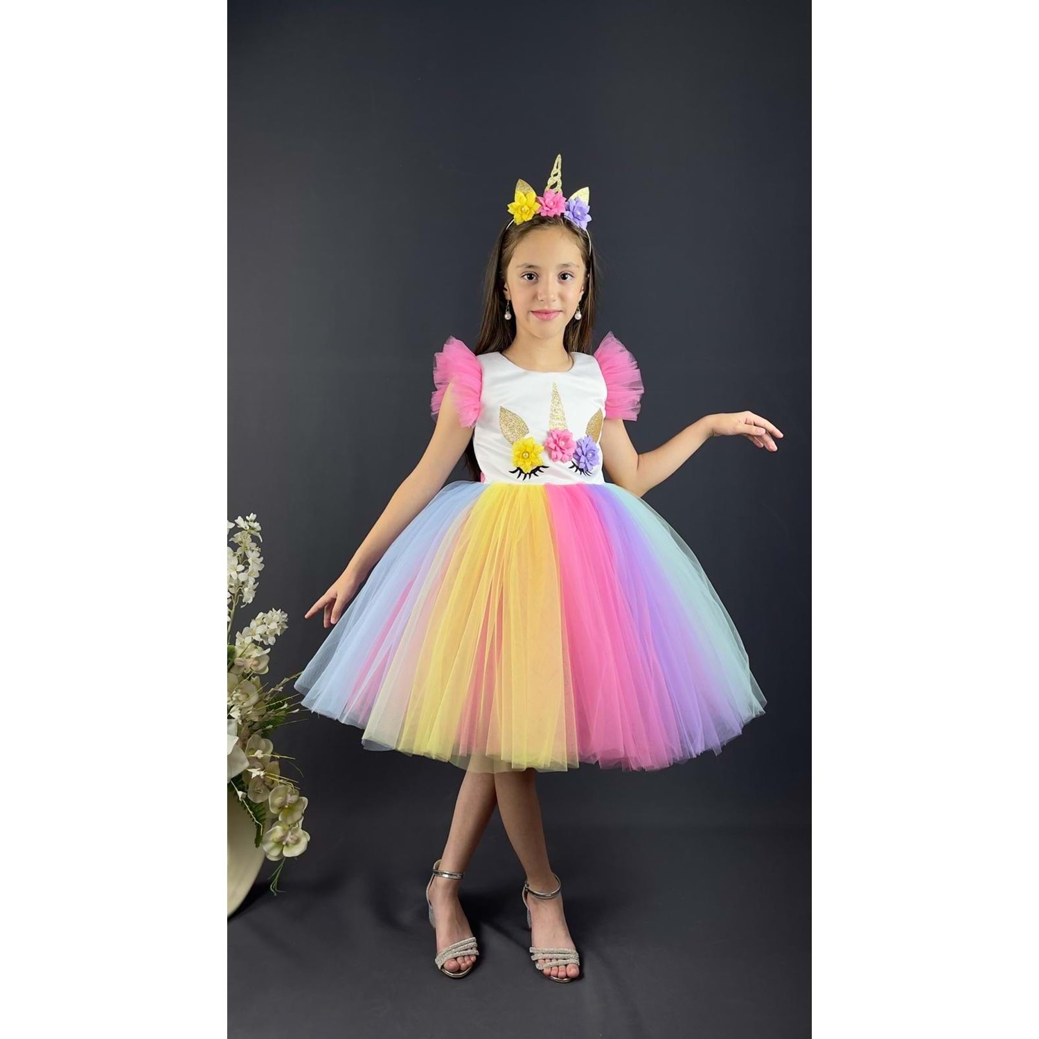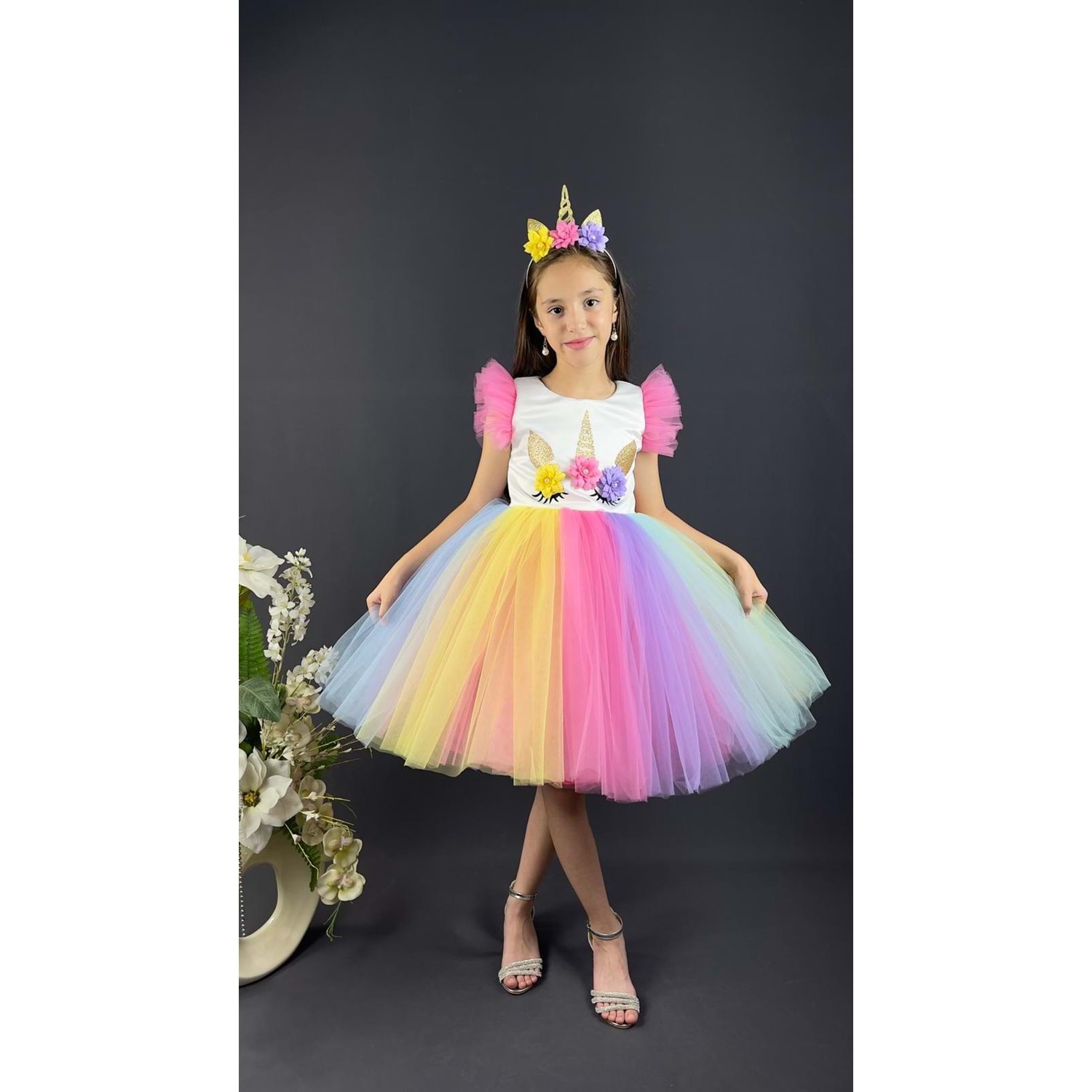 Canlı renkleri ve eğlenceli tasarımıyla öne çıkan rengarenk saç bantlı kız çocuk parti elbisesi, özel günlerde ve partilerde minik prenseslerin enerjisini yansıtır. Doğum günü partileri, kutlamalar, etkinlikler ve özel davetler için ideal bir seçimdir.
