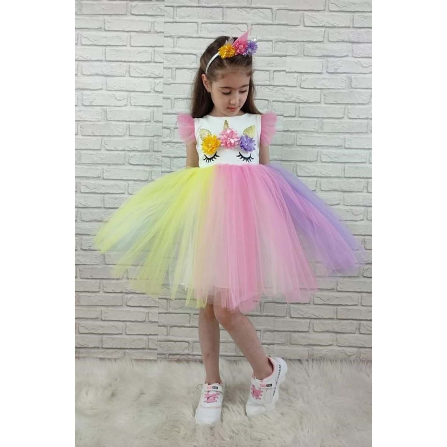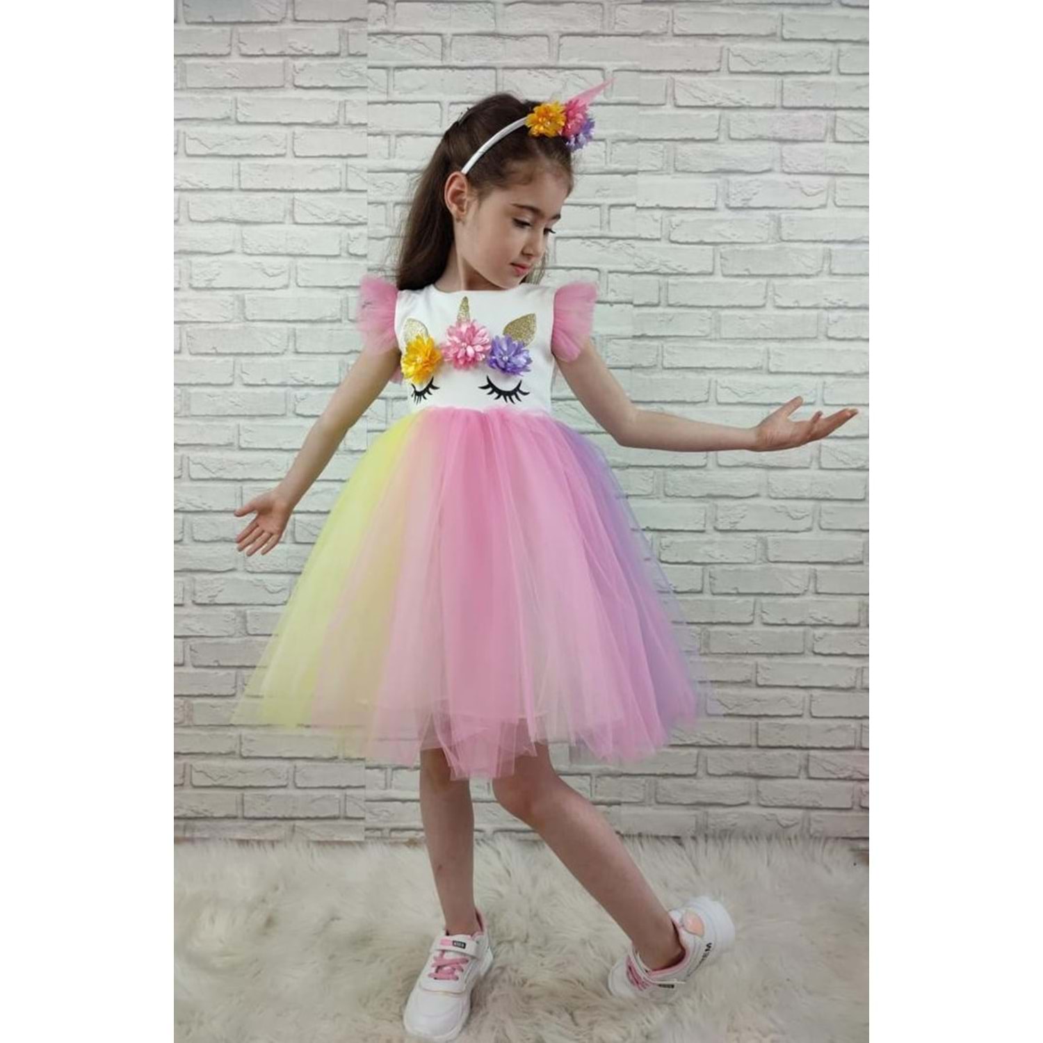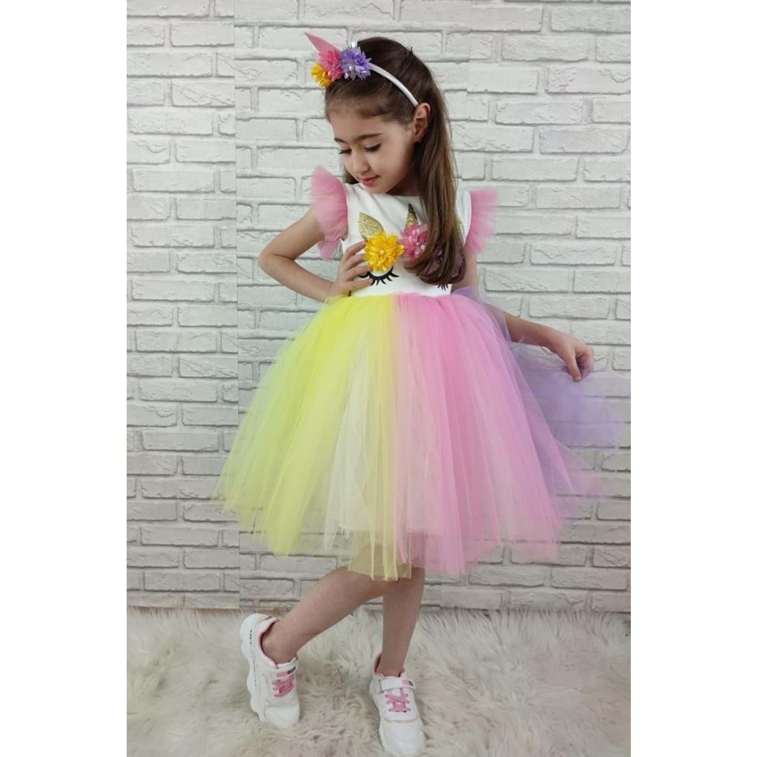 Rengarenk Saç Bantlı Kız Çocuk Parti Elbisesi – Pamuk Astarlı Prenses Elbise