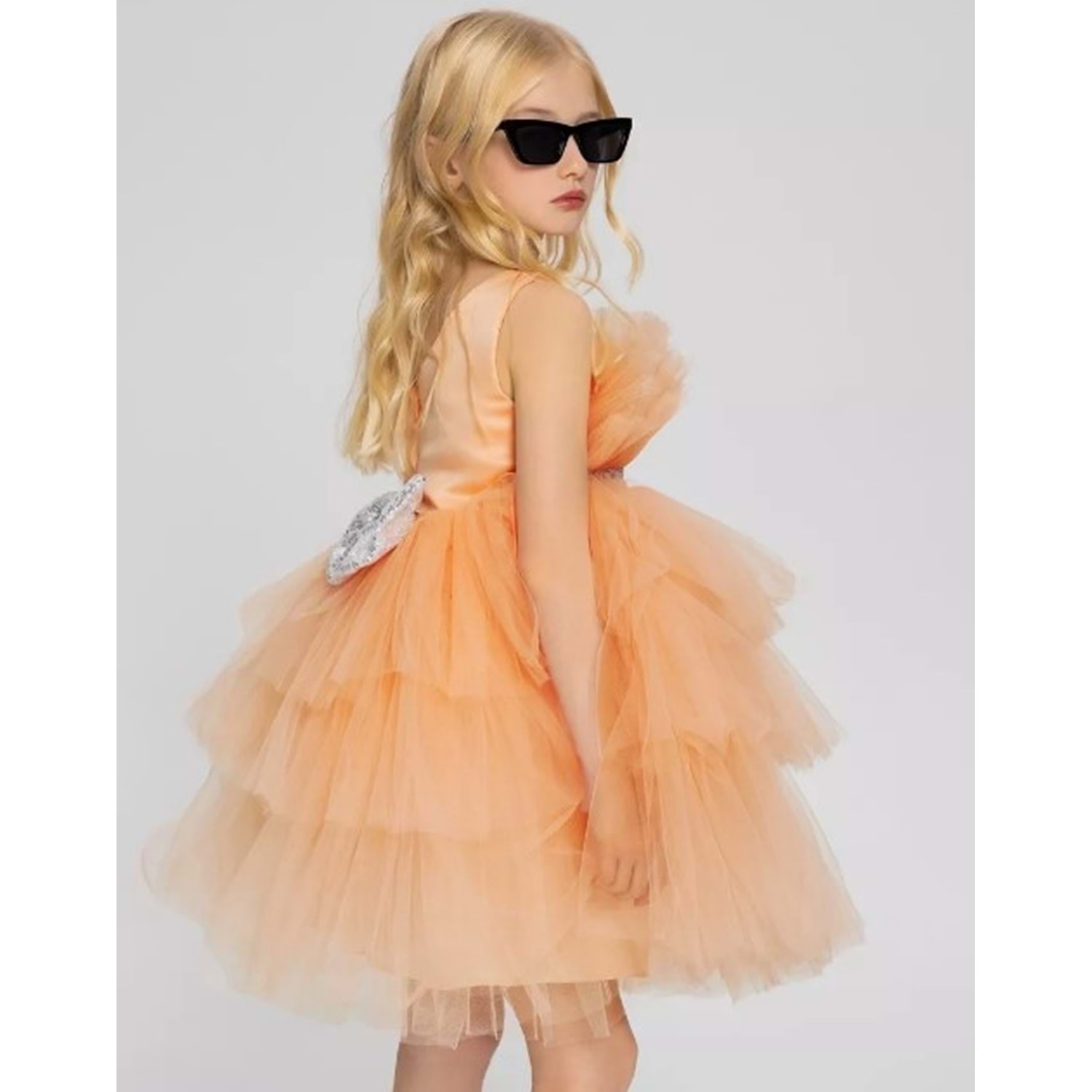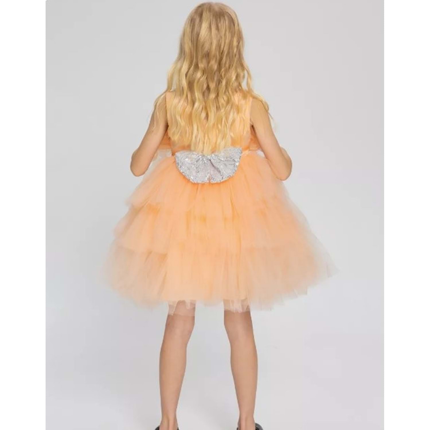 Elbisenin etek kısmında yer alan kat kat tül ve tütü detayları, elbiseye hacim kazandırırken küçük kızlara adeta bir masal kahramanı görünümü sunar. Kabarık ama hafif yapısıyla çocukların hareketlerini kısıtlamadan rahatlıkla oynamalarını sağlar. Tütülü tasarımı sayesinde hem gösterişli hem de eğlenceli bir stil sunar.