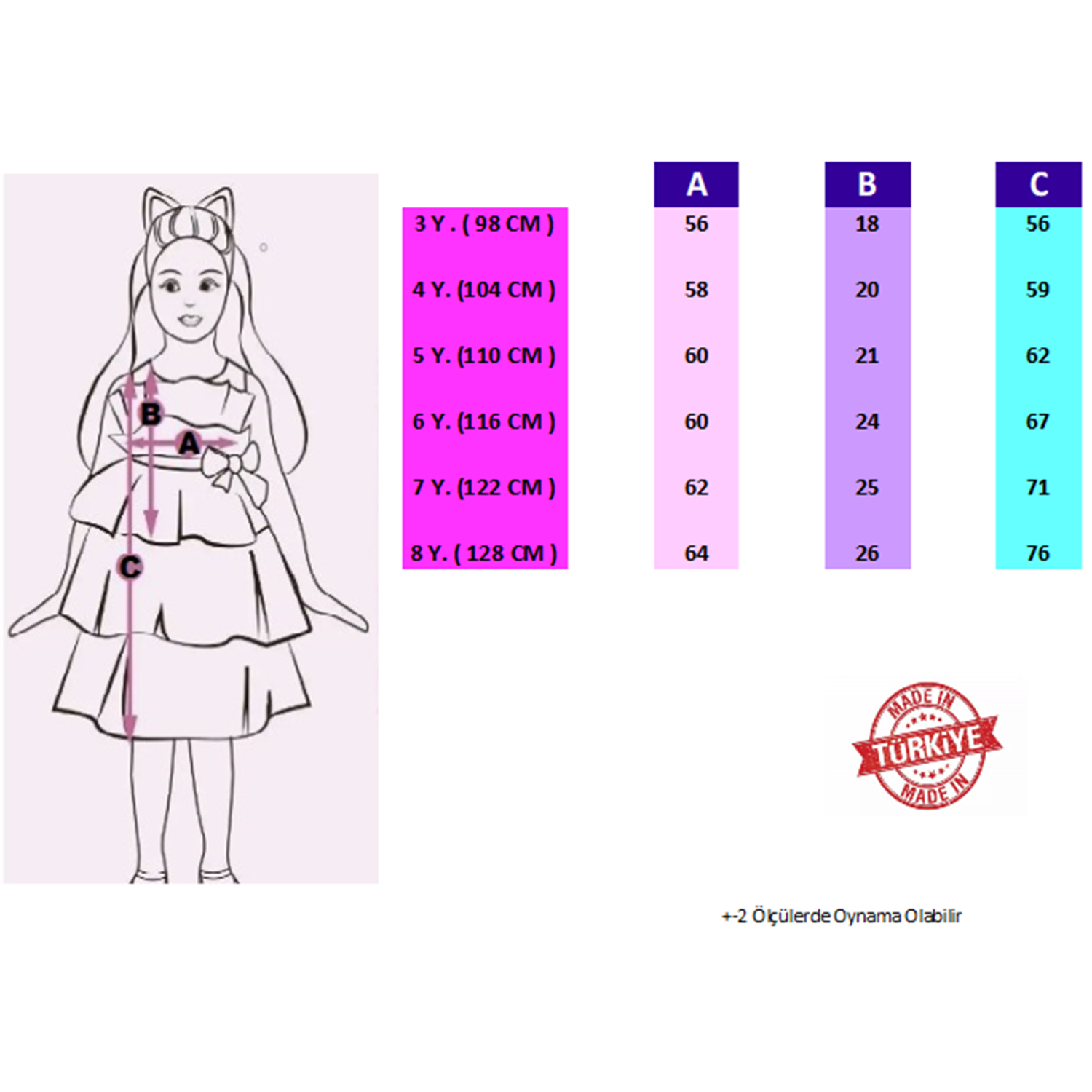 Bu abiye elbise modeli, genellikle 1 yaştan 8 yaşa kadar beden aralıklarında sunulmaktadır. Yaşa uygun kesimi ve ayarlanabilir yapıdaki beli sayesinde, çocukların konforunu ön planda tutar. İç kısmında kullanılan pamuklu astar, çocuğun cildine dost olup tahrişi önler.