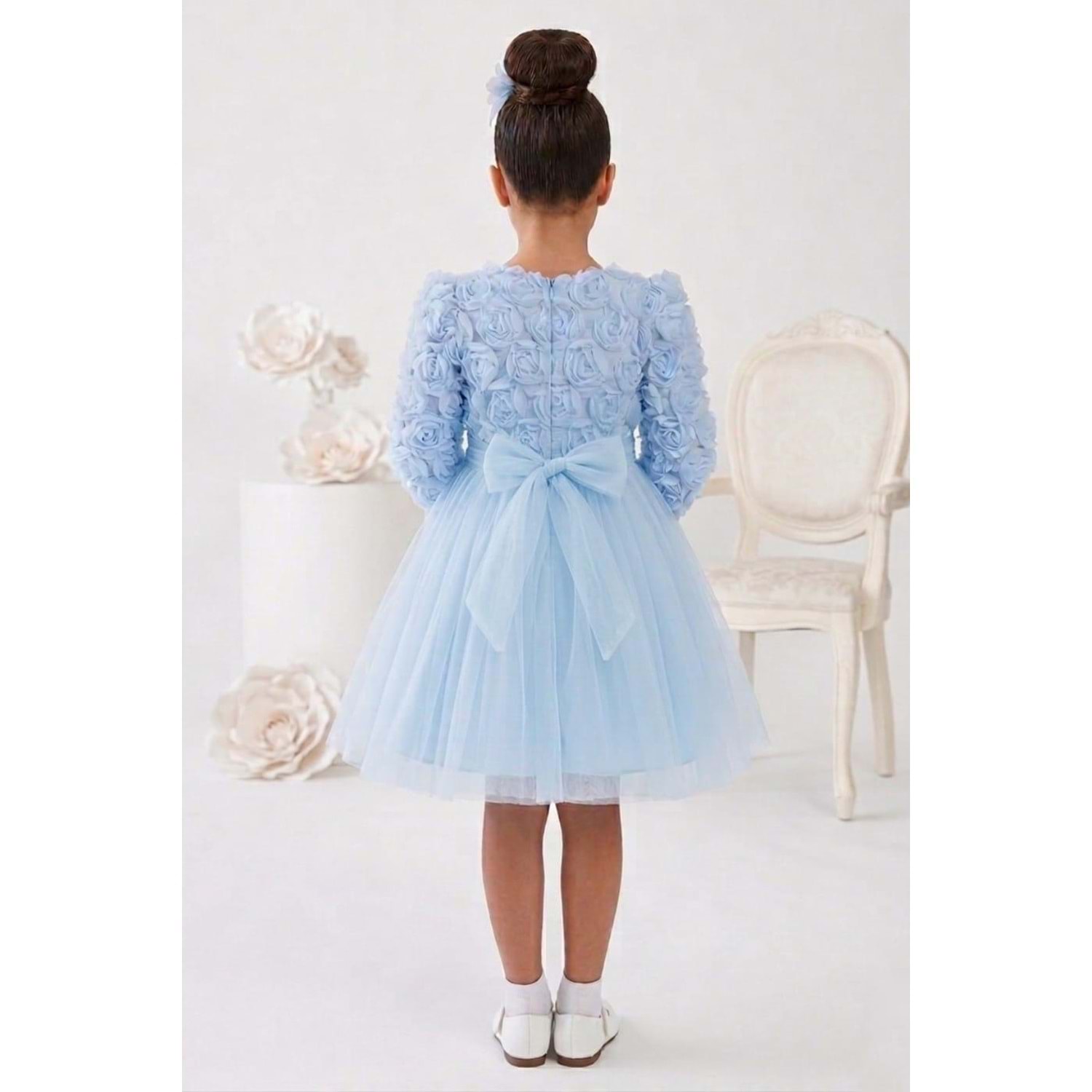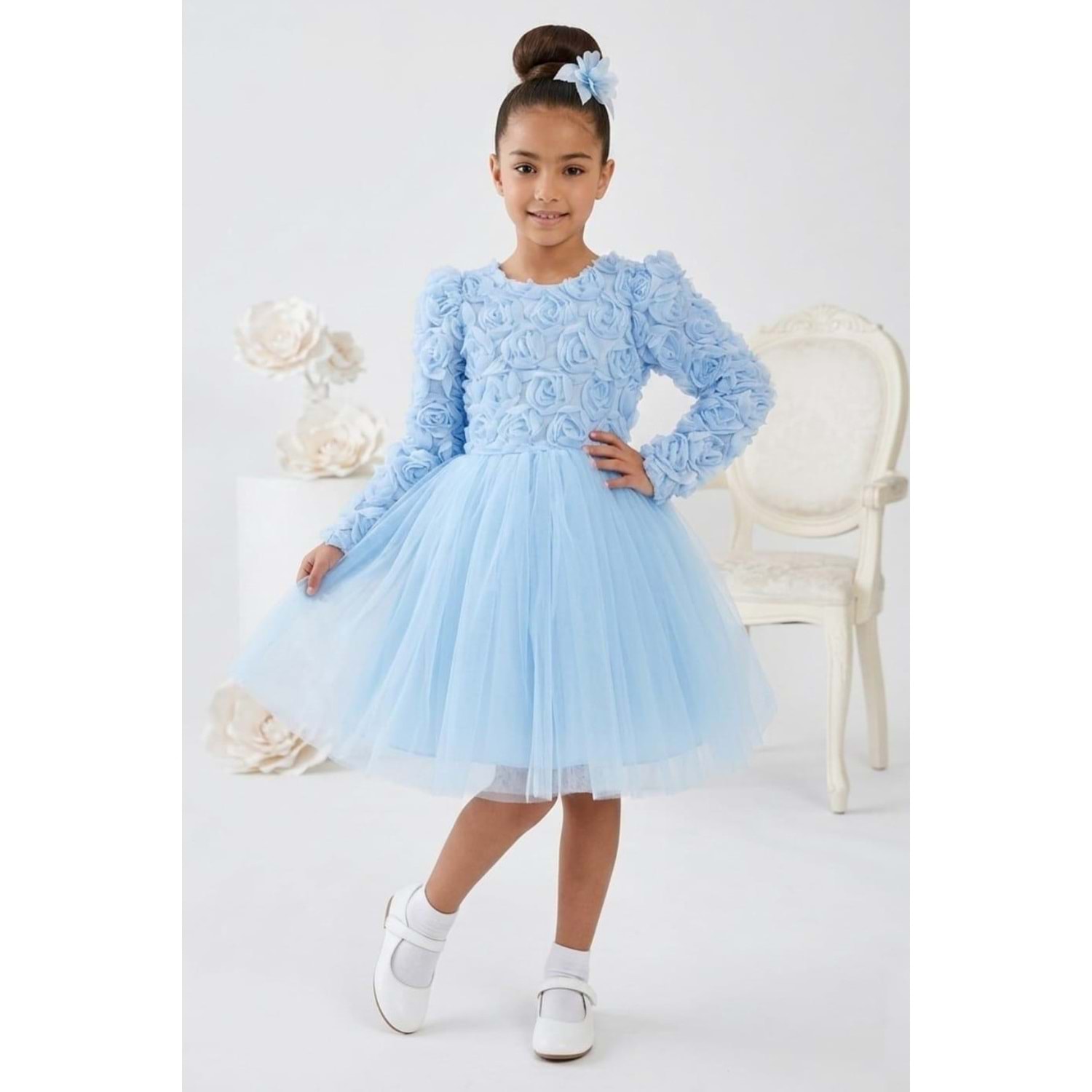 Kısa kollu tasarımı sayesinde yaz ve bahar organizasyonlarında rahatlıkla tercih edilir. Tütü formundaki kat kat tül eteği ve üzerine uygulanan gül detayları ile sahne ışığı gibi parlar. Çocuklar sever, anneler hayran kalır.