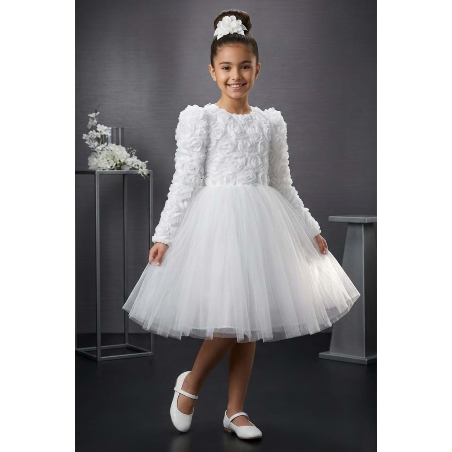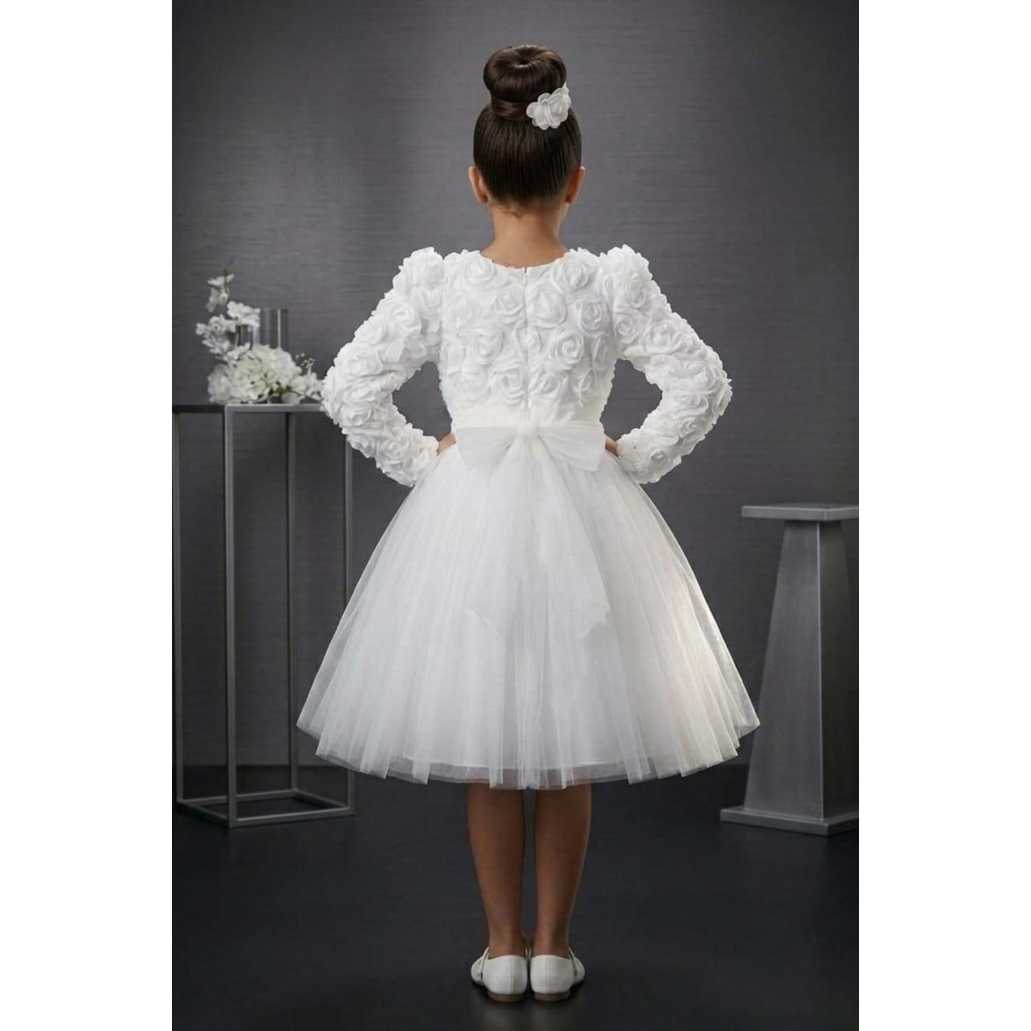 Kısa kollu tasarımı sayesinde yaz ve bahar organizasyonlarında rahatlıkla tercih edilir. Tütü formundaki kat kat tül eteği ve üzerine uygulanan gül detayları ile sahne ışığı gibi parlar. Çocuklar sever, anneler hayran kalır.
