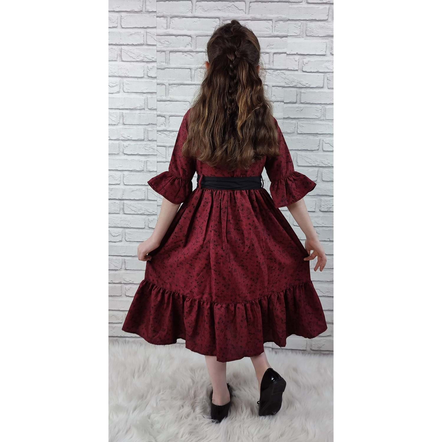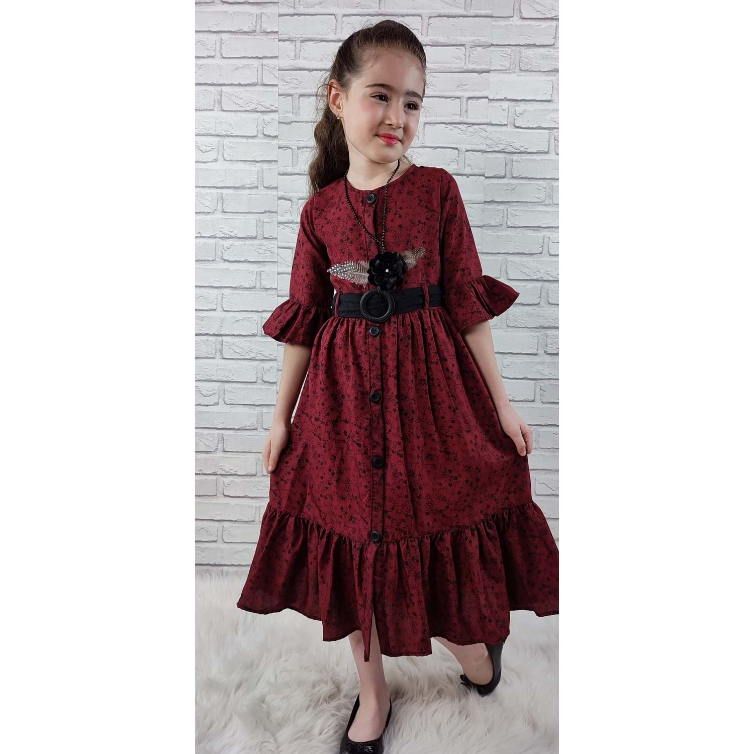 Eski Basma Model Vual Kumaştan Üretilmiş. Bel Kemerli Önden Düğmeli Kız Çocuk Elbise.