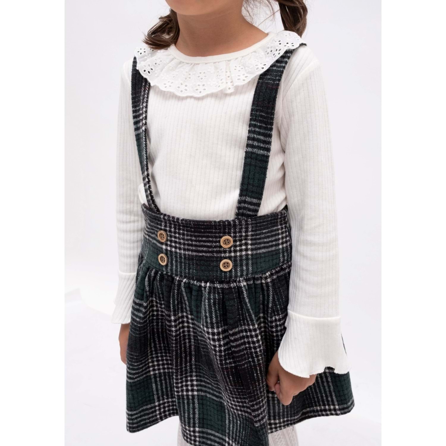 Salopet Askılı Ekose Kumaş İle Modellenmiş Elbise Ve İçimde Fittilli Kumaştan üretilmiş Fisto Yakalı Badisi İle Birlikte İki Parçadan Oluşan Kız Çocuk Takım