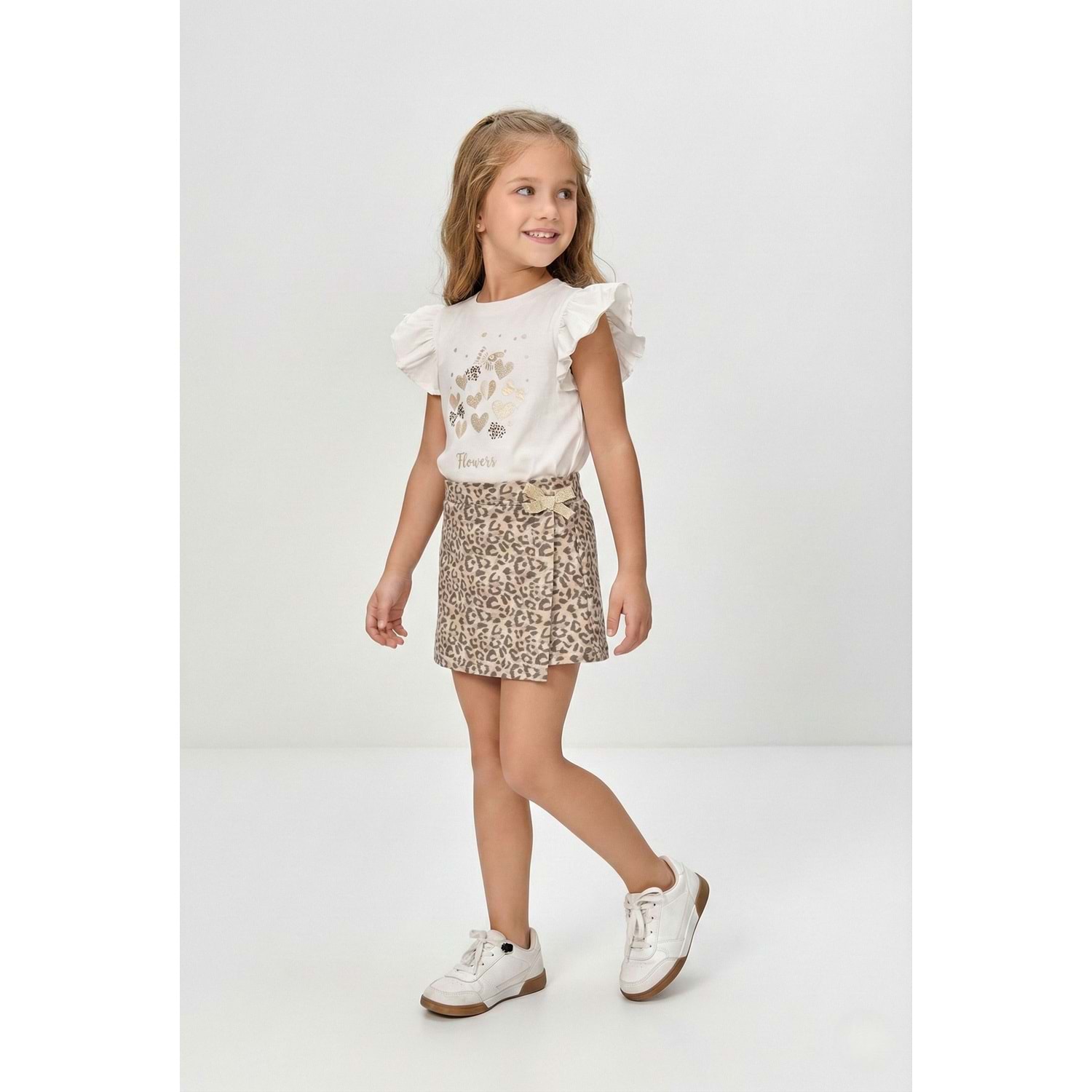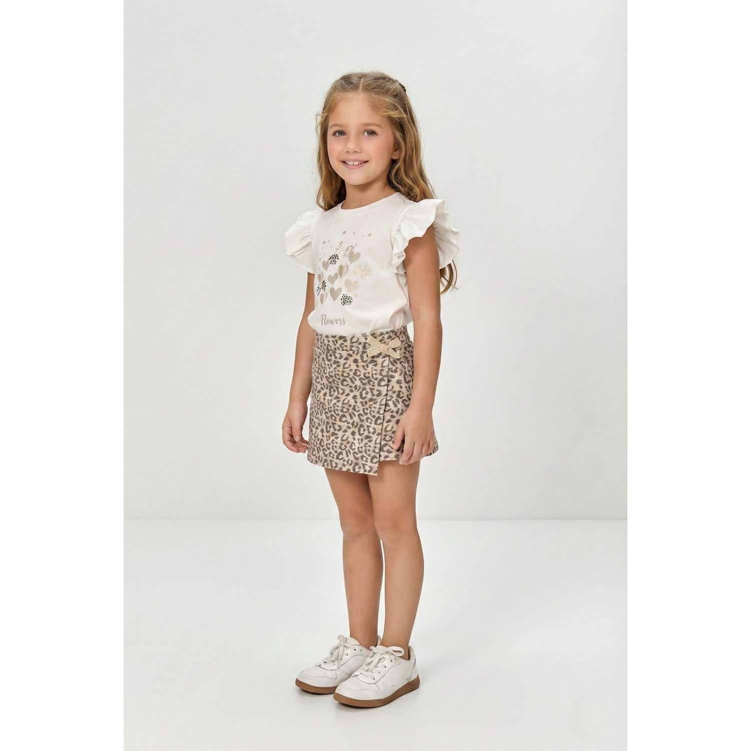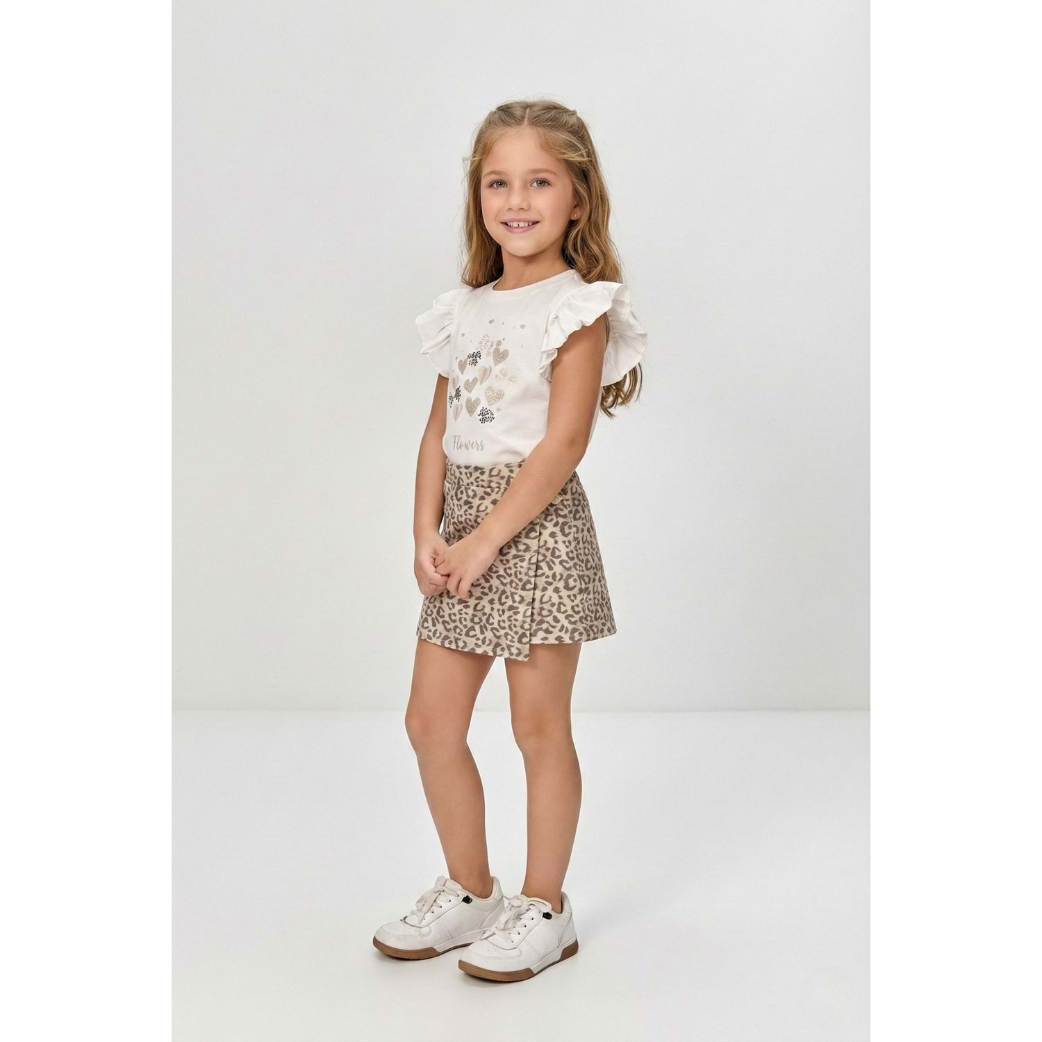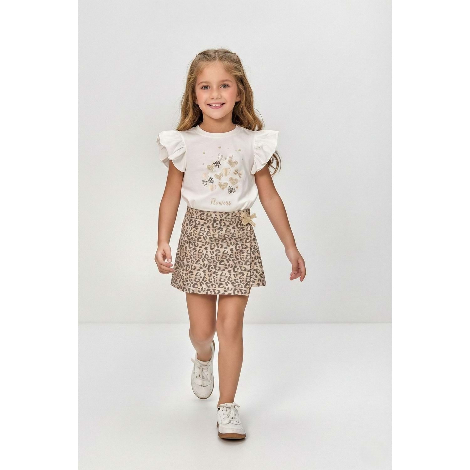 Kız Çocuk Leopar Desenli Etek ve Fırfır Kollu Simli Baskılı Yazlık Takım (3-7 Yaş)