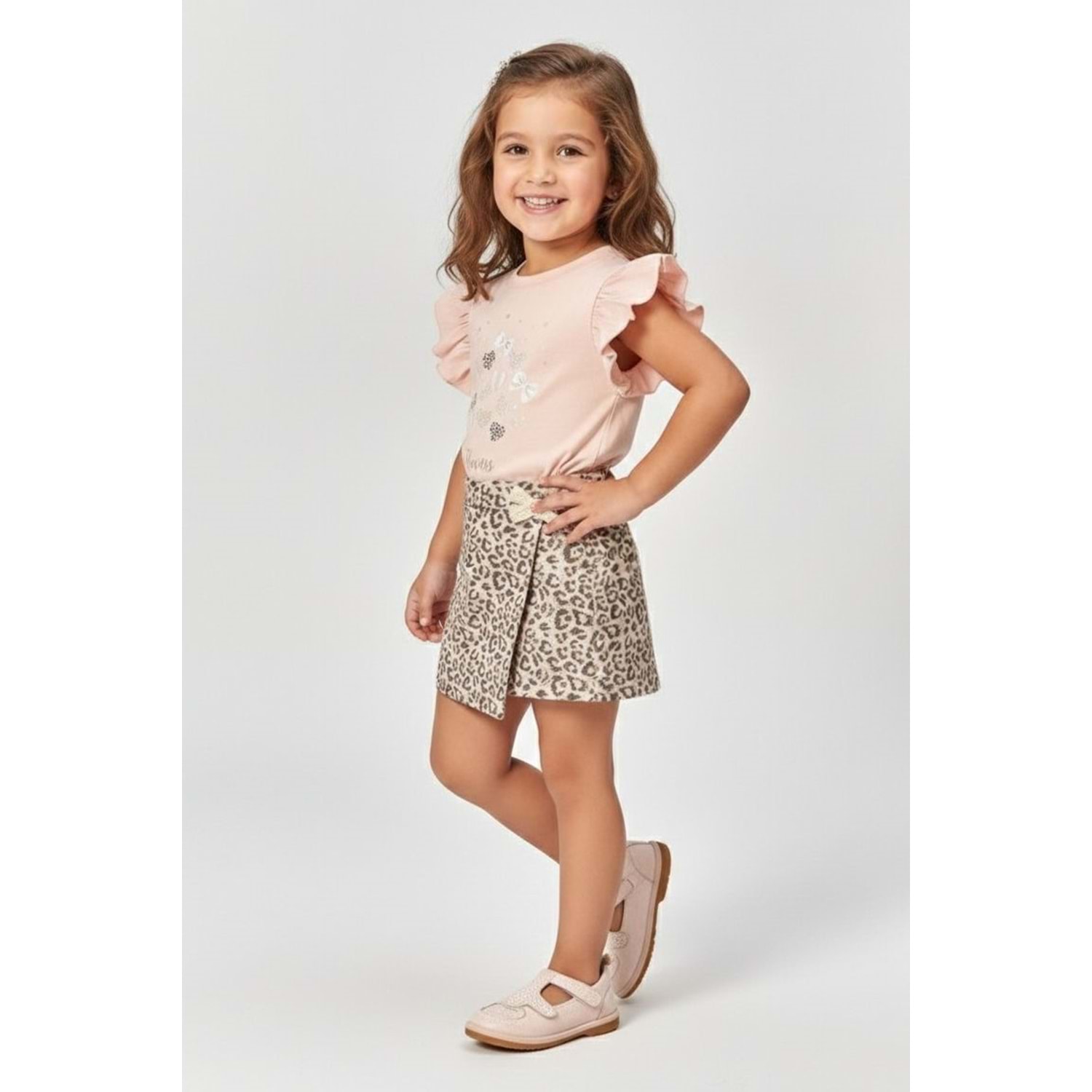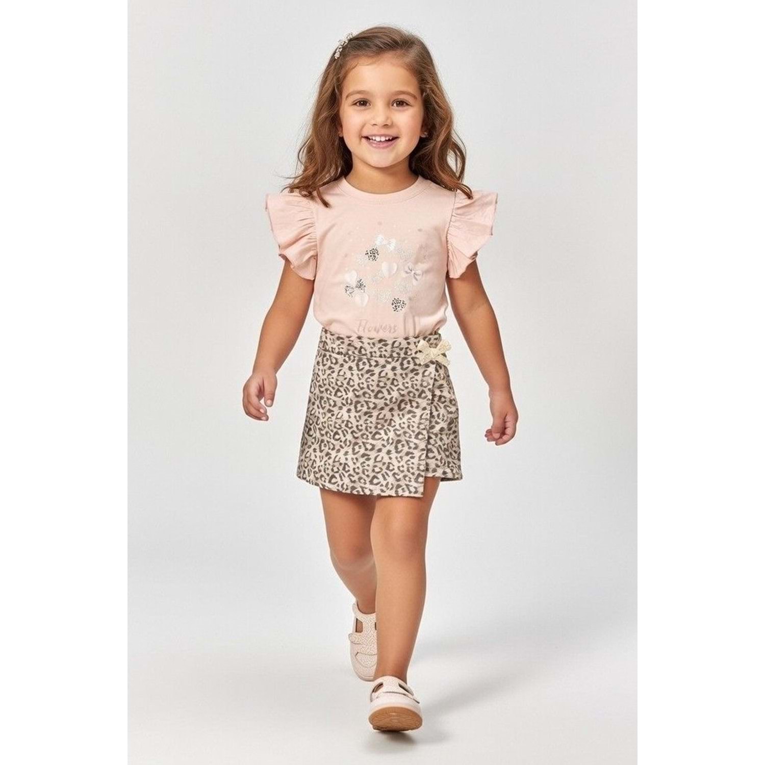 Kız Çocuk Leopar Desenli Etek ve Fırfır Kollu Simli Baskılı Yazlık Takım (3-7 Yaş)
